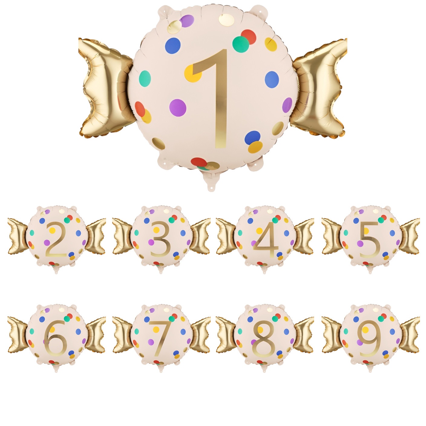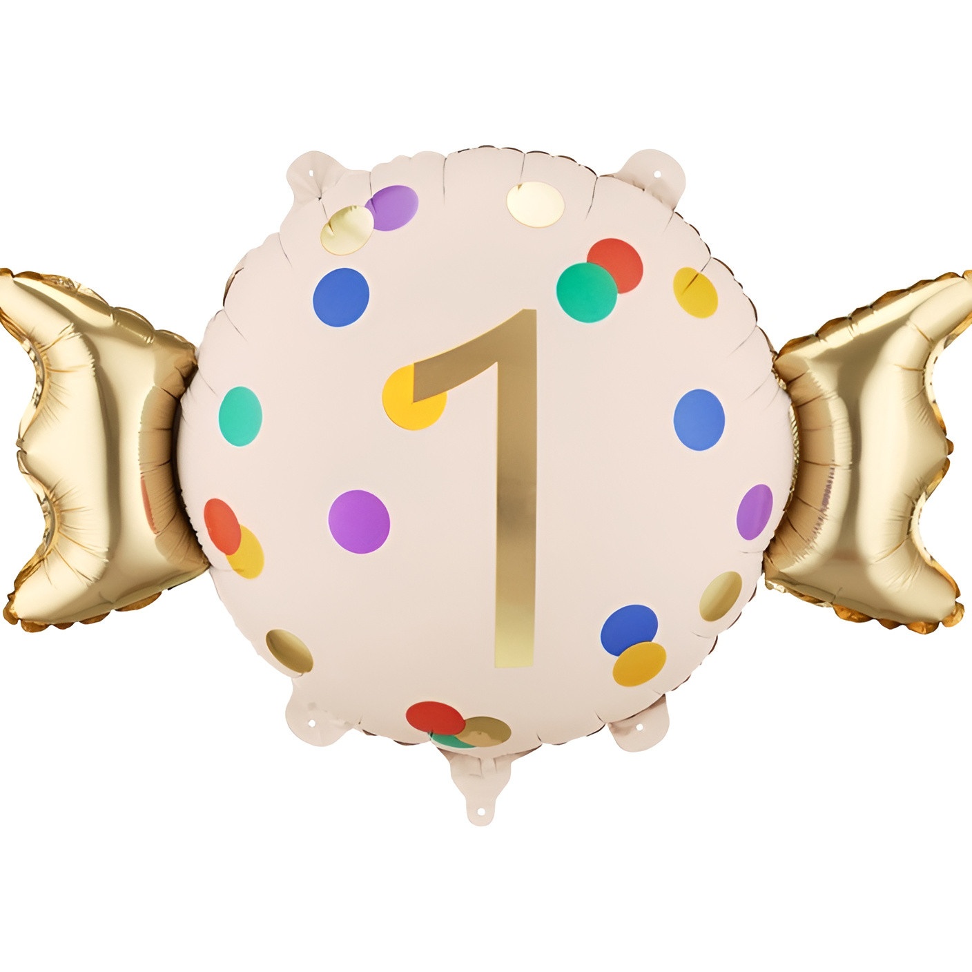 Decoratieve folieballon met het cijfer 1 in een elegante beige?gouden combinatie. Het 'candy'?design met gekleurde stippen geeft een feestelijke en verfijnde touch. Afmetingen vóór opblazen: ca. 76,5 x 48 cm; na opblazen: ca. 61 x 37 cm. Geschikt voor opblazen met lucht en helium en ideaal als eyecatcher tijdens de viering - perfect voor de eerste verjaardag, fotoshoots en het decoreren van sweet tables of speciale hoekjes.