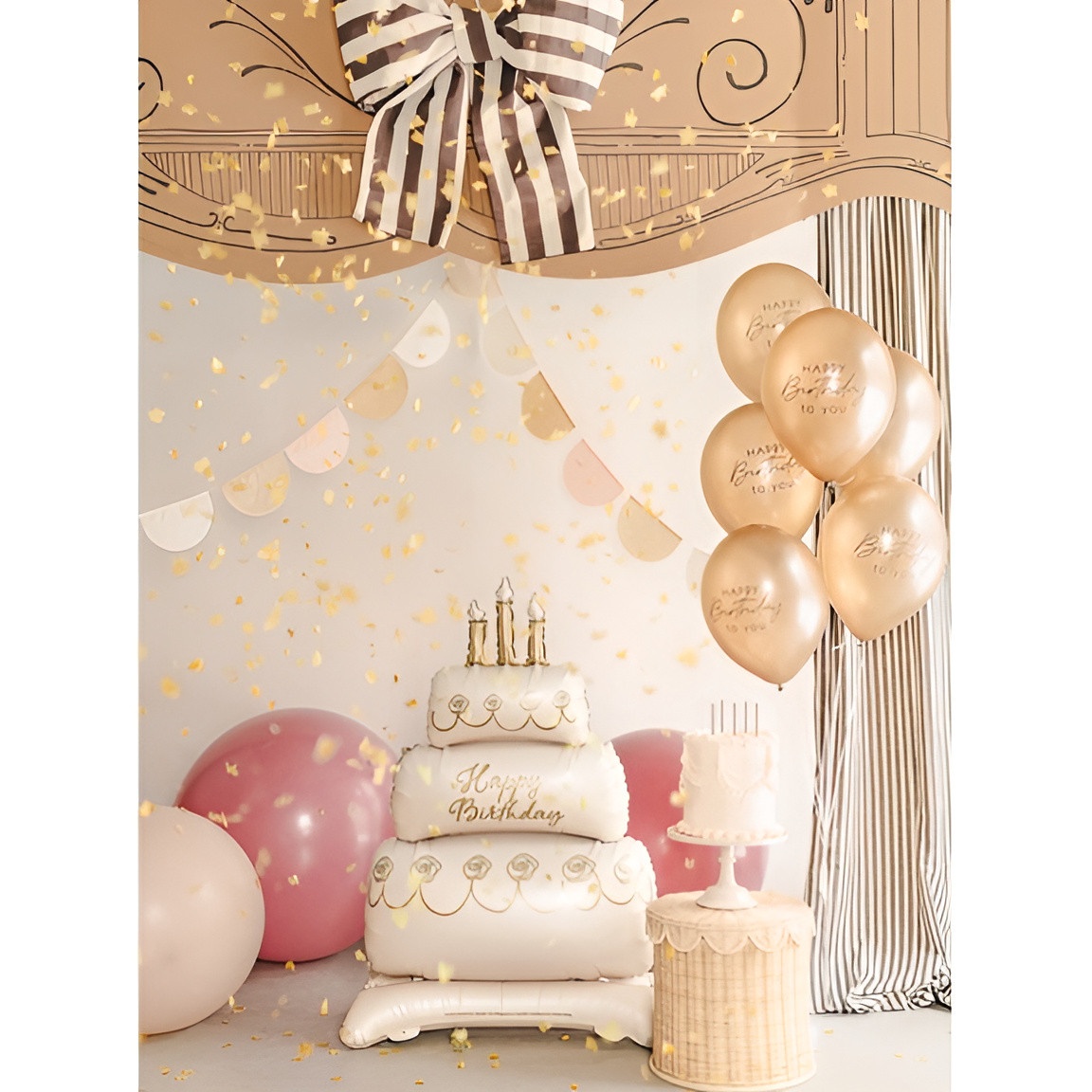 Beige-gouden taartballon in drie lagen die elke viering een verfijnde uitstraling geeft. De chique afwerking met gouden details komt mooi tot zijn recht op neutrale tinten. Deze zelfstaande eye-catcher werkt als tafelmiddenstuk zonder veel ruimte in te nemen. Geschat formaat na opblazen: ca. 70 x 100 cm. Alleen met lucht op te blazen.