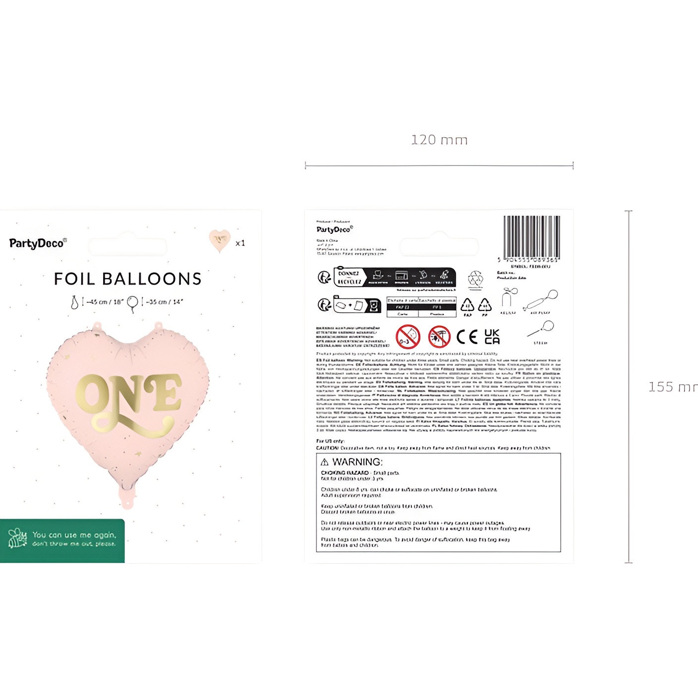 Bij benadering formaat vóór het opblazen: 45 cm (18"), en na opblazen: 35 cm (14"). Geschikt voor opblazen met lucht of helium; behoudt glans en vorm dankzij het folie.