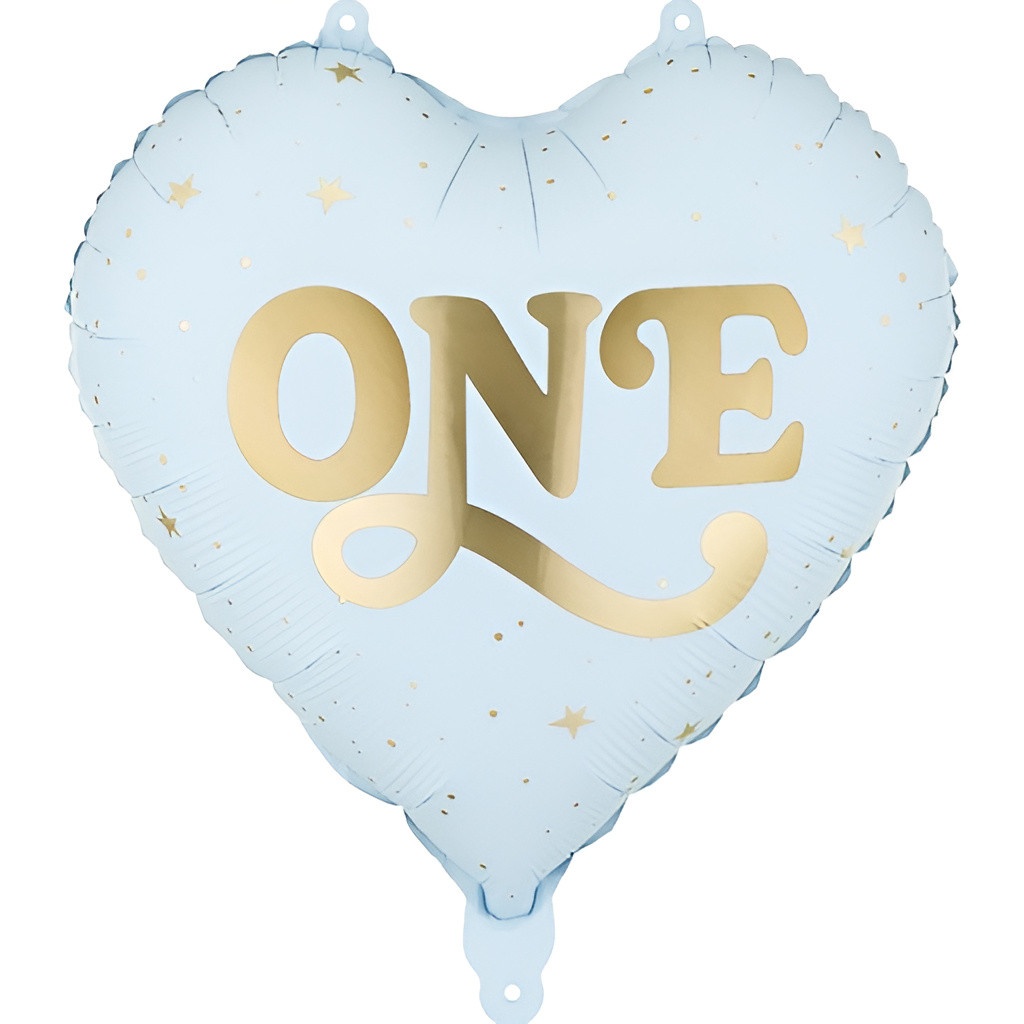 Hartvormige folieballon in lichtroze met gouden "ONE"-opdruk, ontworpen om een elegante uitstraling te geven aan de decoratie voor een eerste verjaardag.