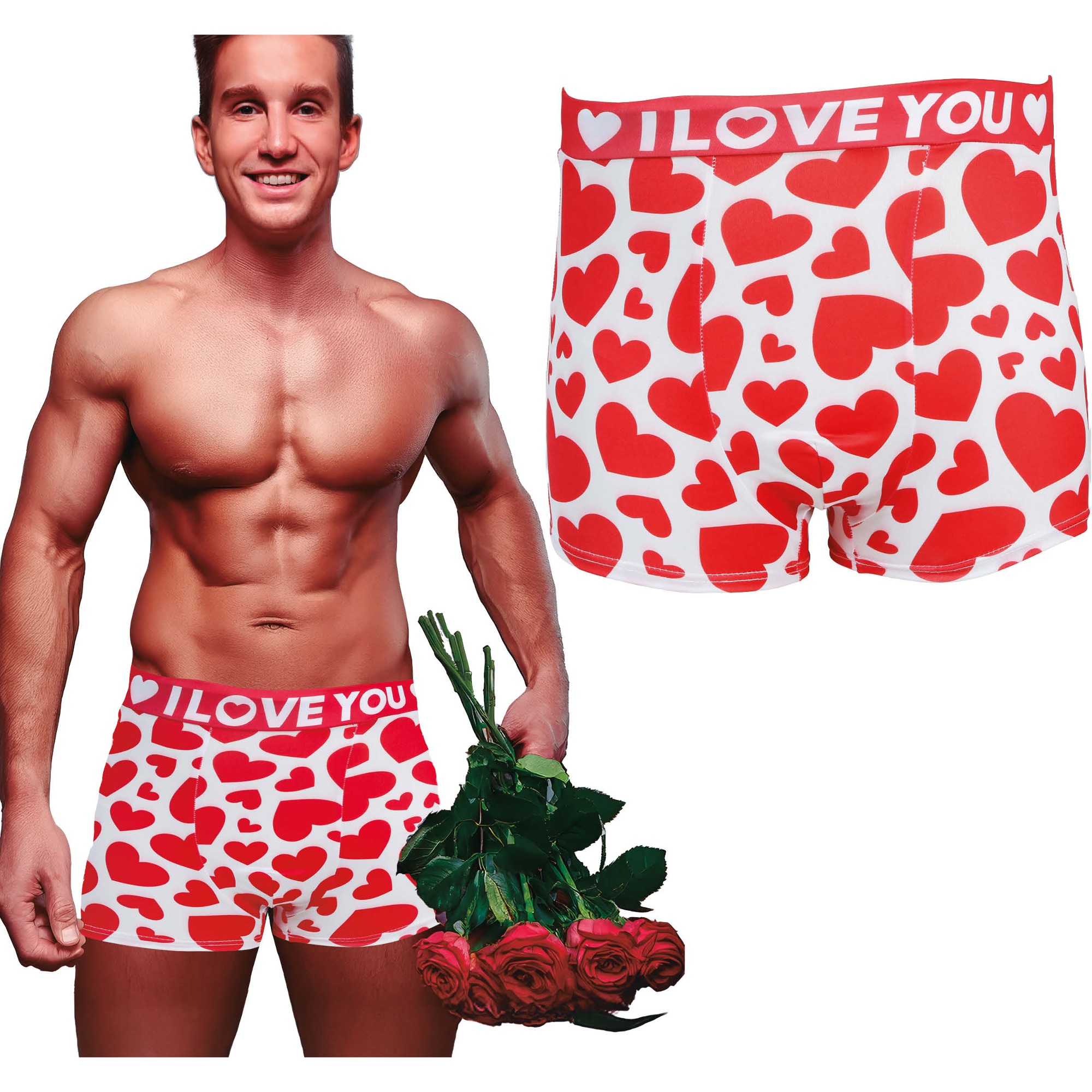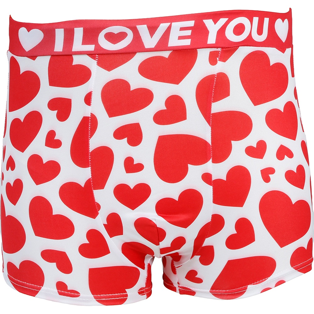 I Love You-boxers met een rood-witte hartjesprint, speciaal ontworpen om te verrassen op Valentijnsdag en andere romantische gelegenheden. Het ontwerp met een opvallende tailleband waarop "I LOVE YOU" staat, geeft een speels en sentimenteel detail.