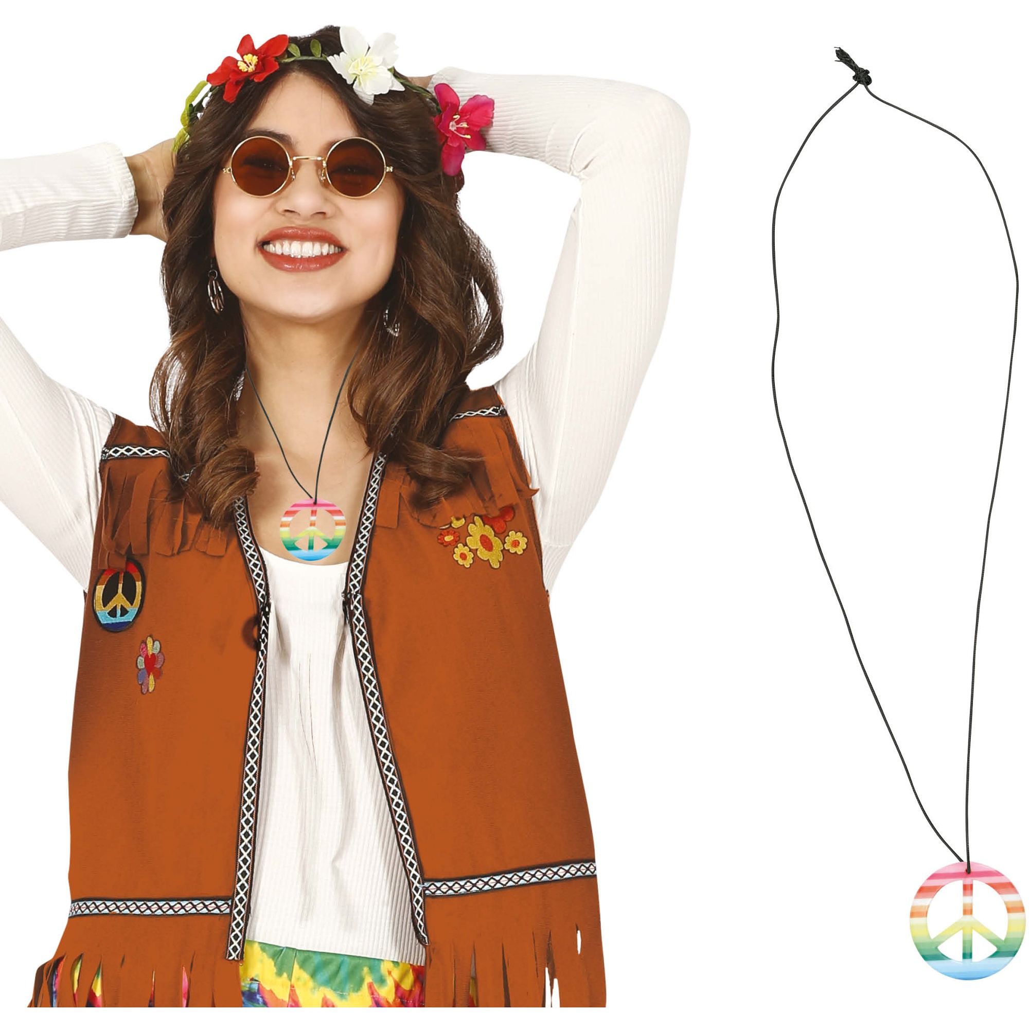 Veelkleurige hippie?hanger met het klassieke vredesteken, ideaal om retro?looks en jaren '60?kostuums compleet te maken. Het opvallende verloopontwerp voegt kleur en karakter toe aan elke feestoutfit. Licht en comfortabel, perfect voor feestjes, carnaval en thema?evenementen. Makkelijk te combineren met bloemenkransen, ronde zonnebrillen en vintagevestjes.