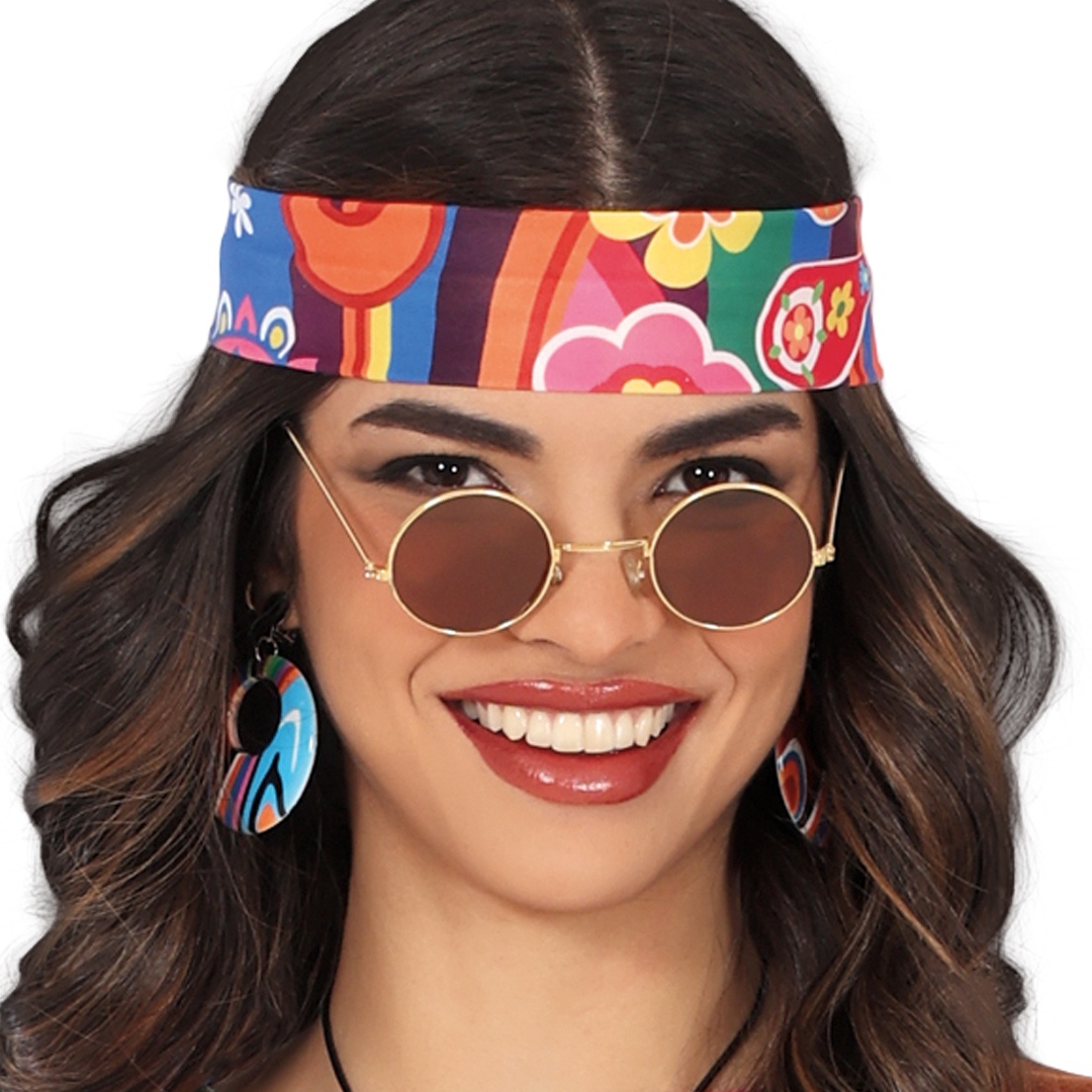 Kleurrijk vrouwenhippiekostuum uit de jaren zeventig waarmee je zult schitteren tijdens carnaval, verjaardagen en themafeesten in het algemeen. Vrede en plezier!