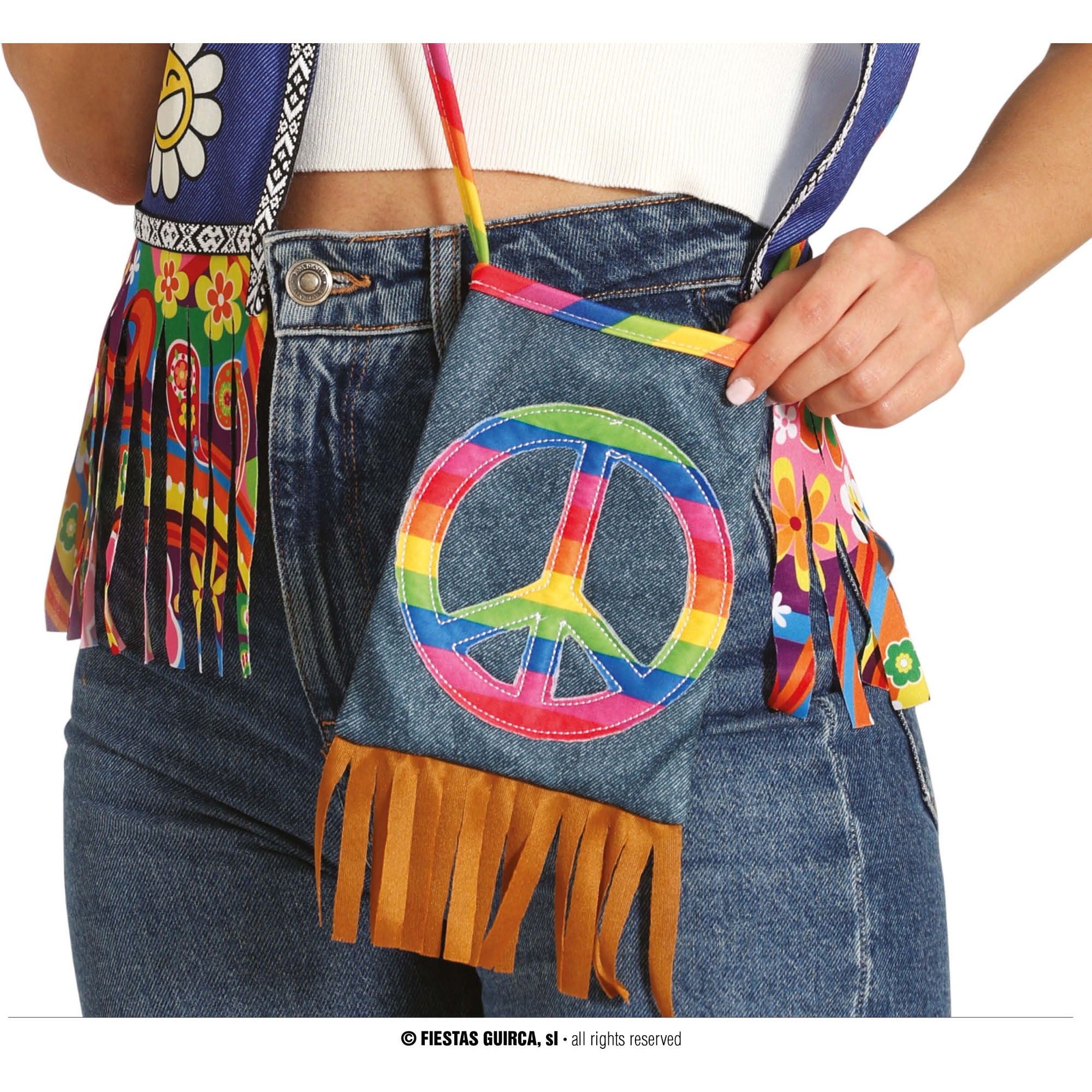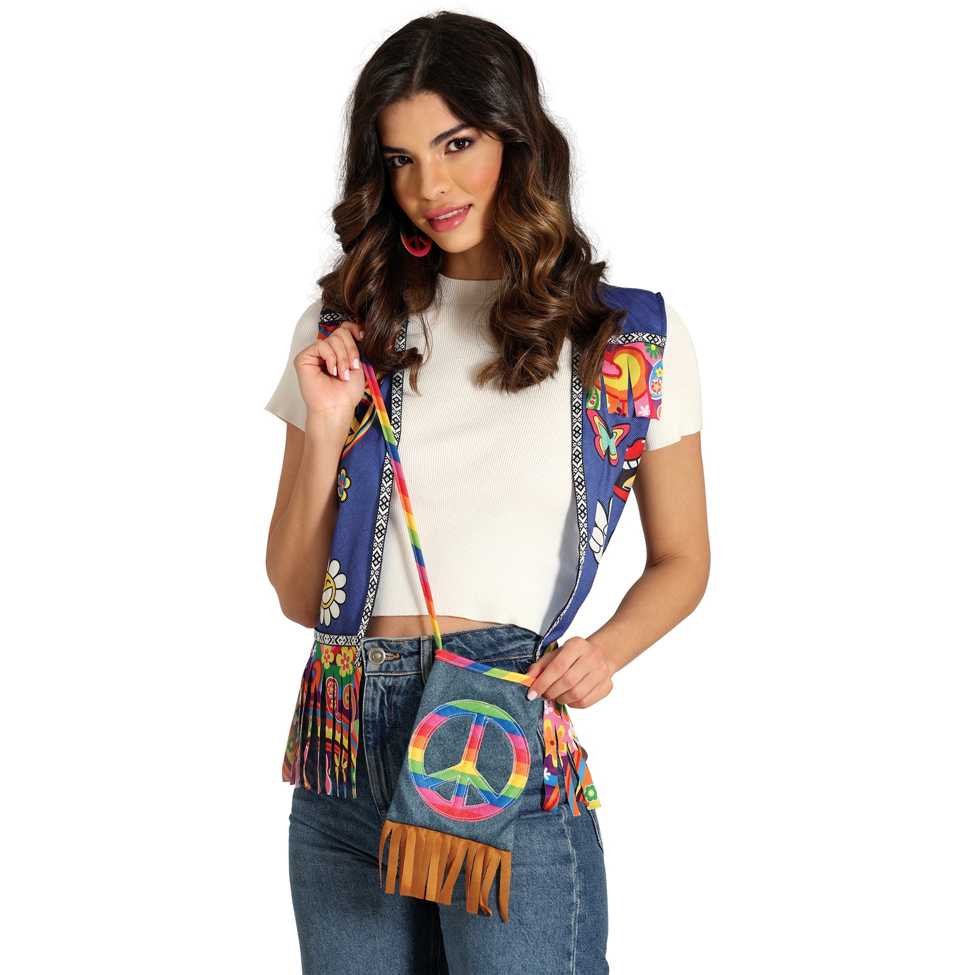 Ideaal accessoire voor hippie-looks en kostuums. Retro schoudertas met een patch van het vredessymbool in levendige kleuren en franjes aan de onderkant. Gemaakt van slijtvast en makkelijk te onderhouden polyester. Compact formaat van 27 x 15 cm, perfect om alleen het essentiële mee te nemen naar feestjes, carnaval of festivals. De schouderriem zorgt ervoor dat je de tas comfortabel over de schouder of crossbody draagt en geeft iedere outfit een boho-touch.