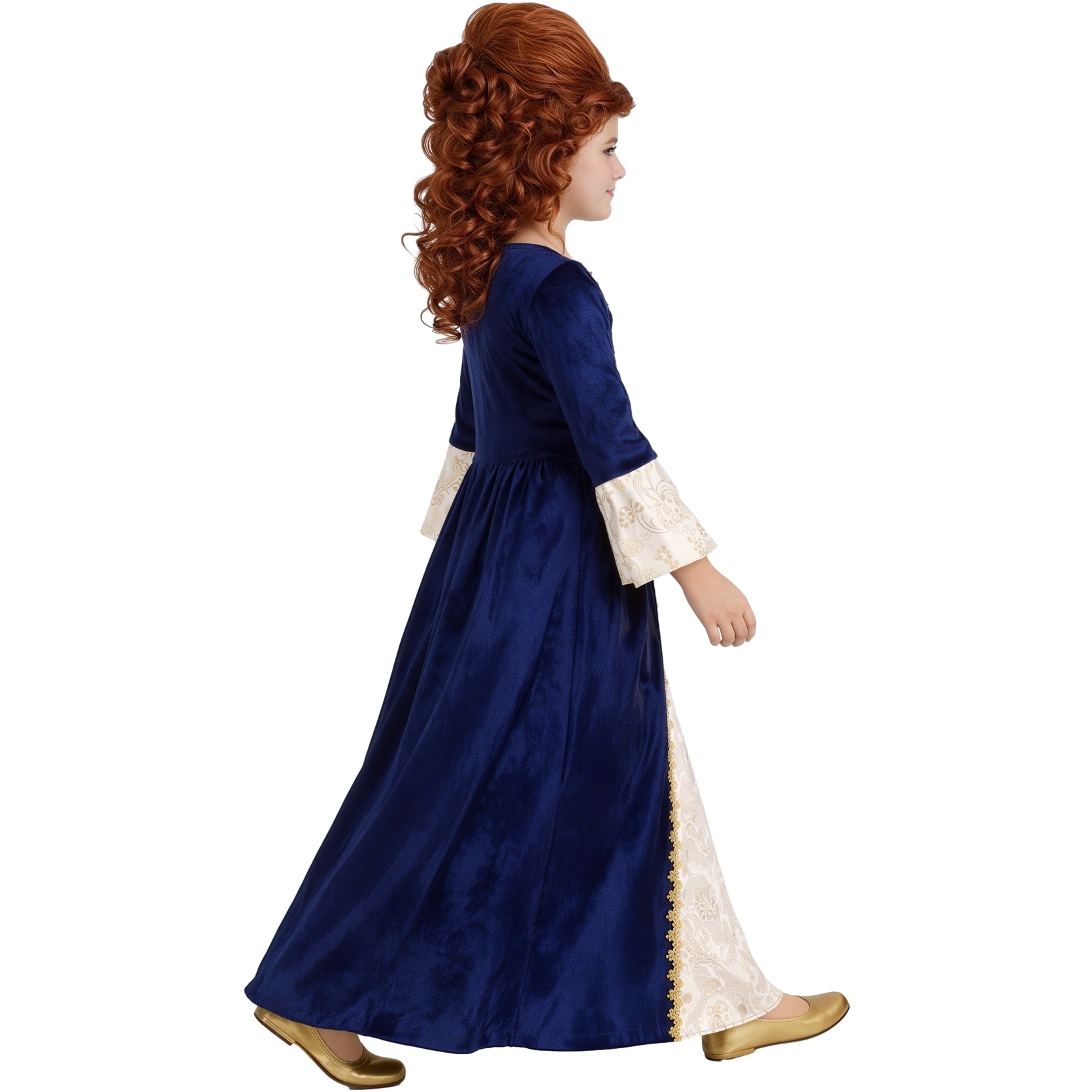 Dit kostuum voor meisjes bestaat uit een blouse met lange mouwen en een lange rok in marineblauw en crème, met gouden randen en decoratieve motieven aan de voorkant en op de manchetten.