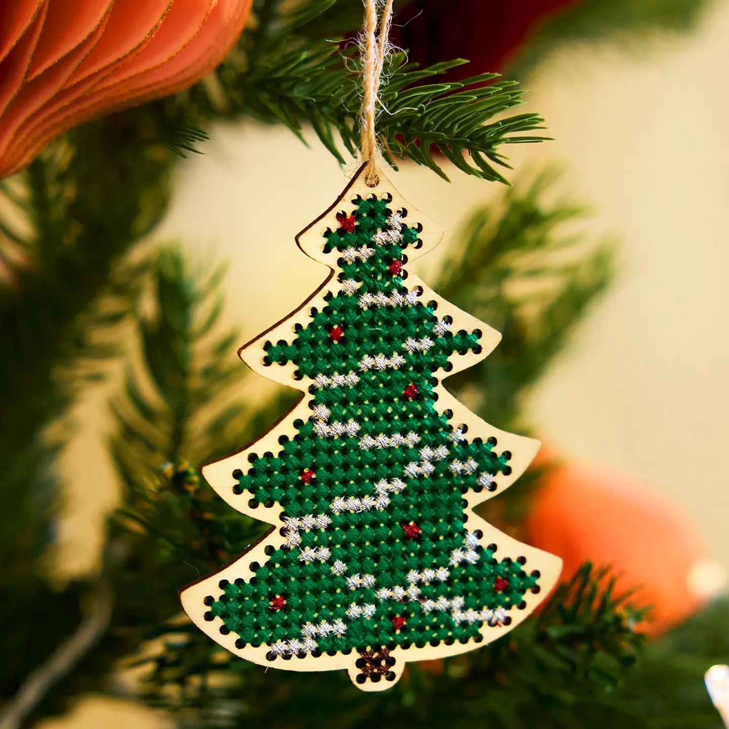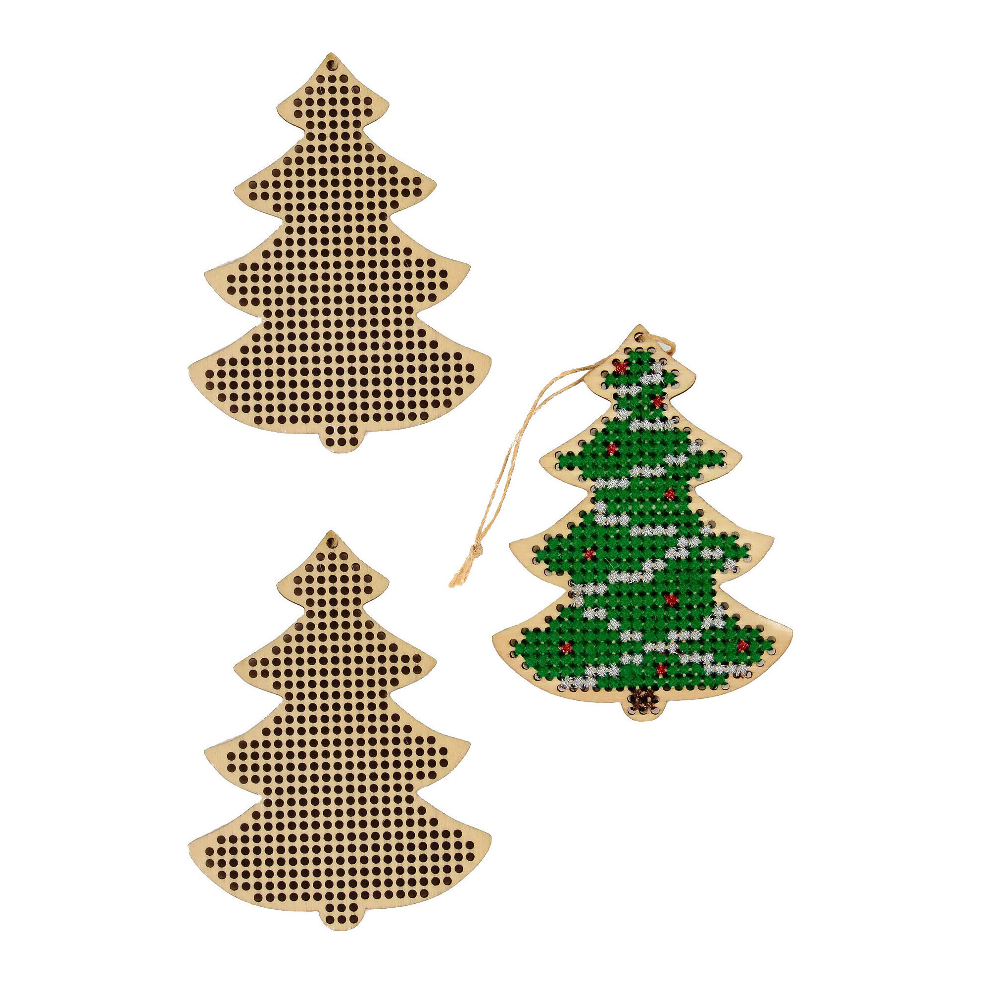 Borduur je eigen kerstversieringen in de vorm van een boom, perfect om een creatieve touch aan je kerstboom of andere seizoensdecoraties toe te voegen.