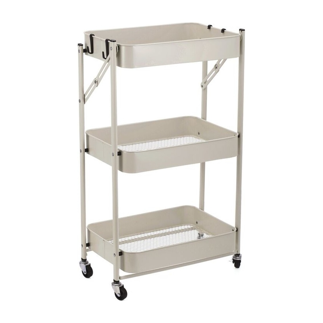 Multifunctionele inklapbare bijzetwagen in naturel afwerking, ontworpen om de organisatie in keuken en huis te vergemakkelijken. Het drievoudige frame biedt praktische opbergruimte voor keukengerei, schoonmaakmiddelen, badkameraccessoires of kantoorbenodigdheden. Draaibare wielen en compact ontwerp maken het verplaatsen tussen kamers en het opbergen wanneer hij niet wordt gebruikt zeer gemakkelijk. Neutrale afwerking die naadloos past bij verschillende woonstijlen.