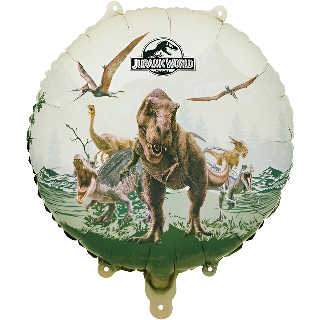 Ronde folieballon met Jurassic World-motief en een imposante T?Rex, perfect om kinderfeestjes een jurassische touch te geven. Het meerkleurige ontwerp toont een dinosaurus-scène met veel detail en visuele impact.