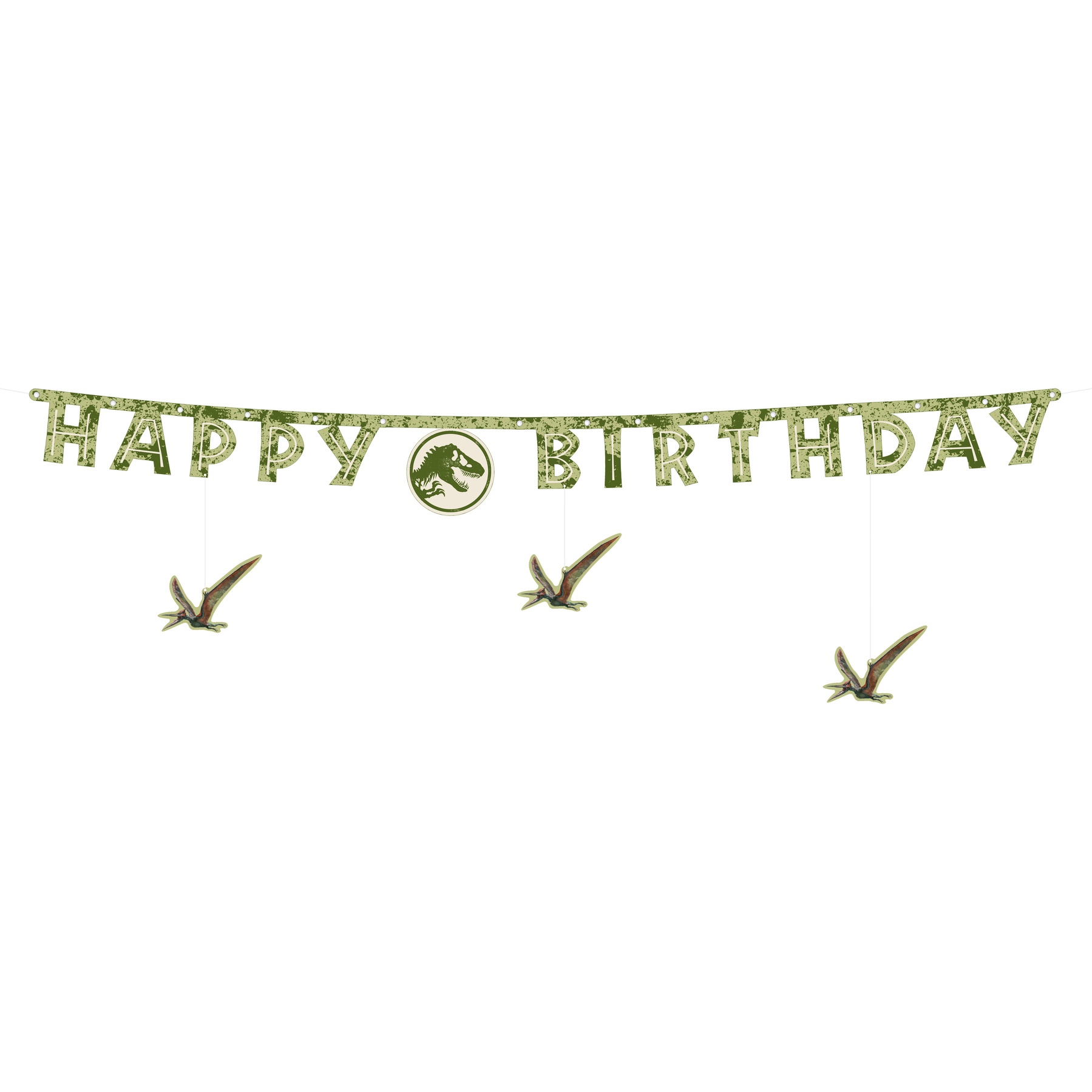 Decoratieve slinger met Jurassic World-thema, perfect voor kinderfeestjes. De groene letters hebben een camouflage-effect en dinosauriummotieven die zorgen voor een avontuurlijke en opvallende uitstraling. Gemaakt van gekleurd papier voor een speelse en dynamische sfeer.
