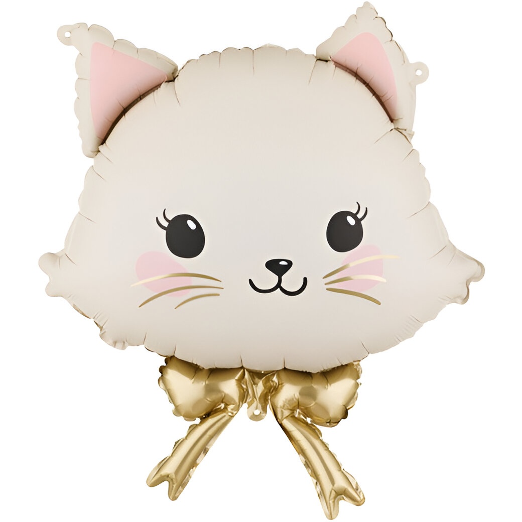 Folieballon in de vorm van een kattengezicht in kawaii-stijl, uitgevoerd in crème en lichtroze met een glanzende gouden strik. Geeft een zoete en elegante touch aan kinderfeestjes en fotohoekjes.