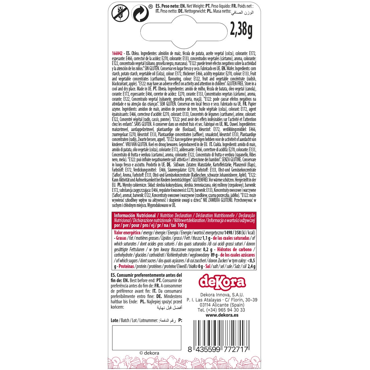 Ingrediënten: Koolzaadolie, Maiszetmeel, Aardappelzetmeel, Kleurstoffen: E122, E133, E172, Zuurteregelaar: E270, Plantaardig concentraat: Saffloer, Zwarte bes, Appel, Radijs, Smaakstof: Vanille.