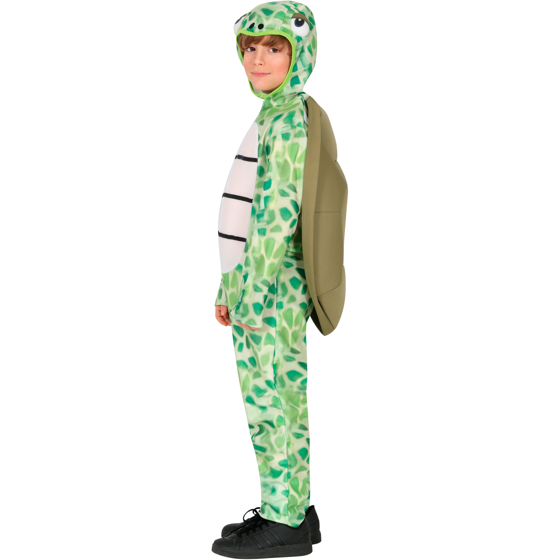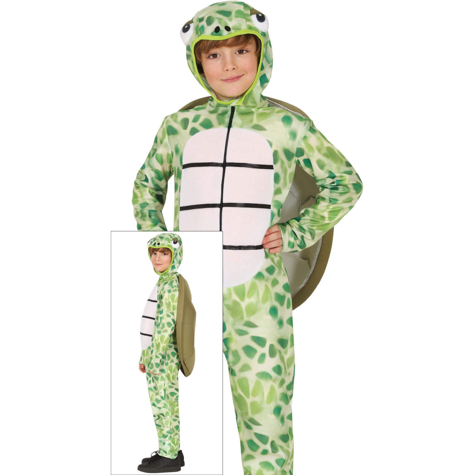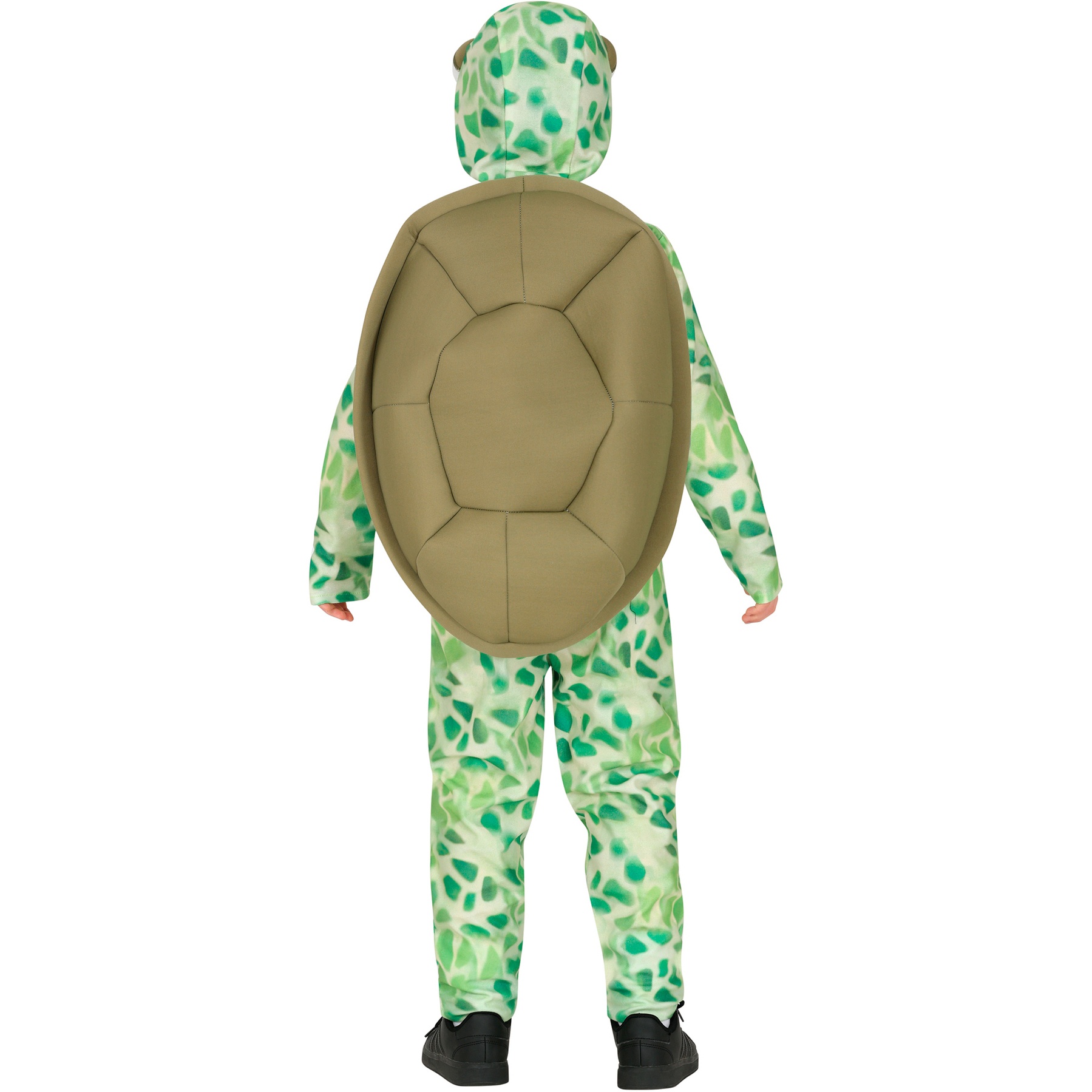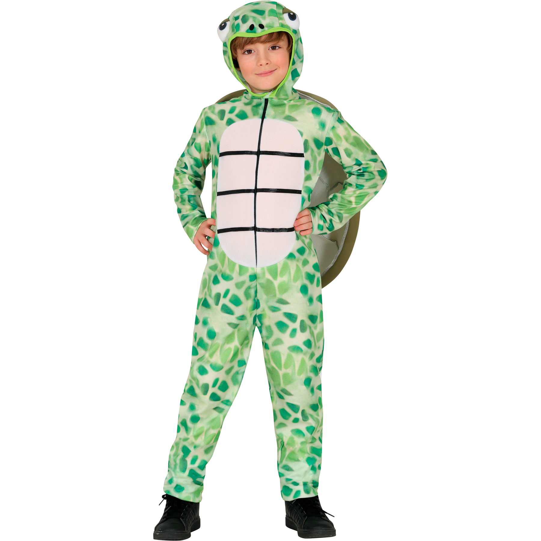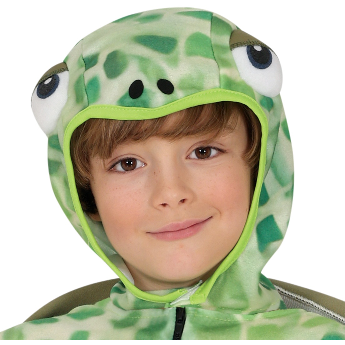 Mooi kinder schildpad pak dat bestaat uit een jumpsuit met een zeer mooi bedrukt bladerendesign. De kap is bevestigd aan de jumpsuit en deze heeft een rits aan de voorkant.