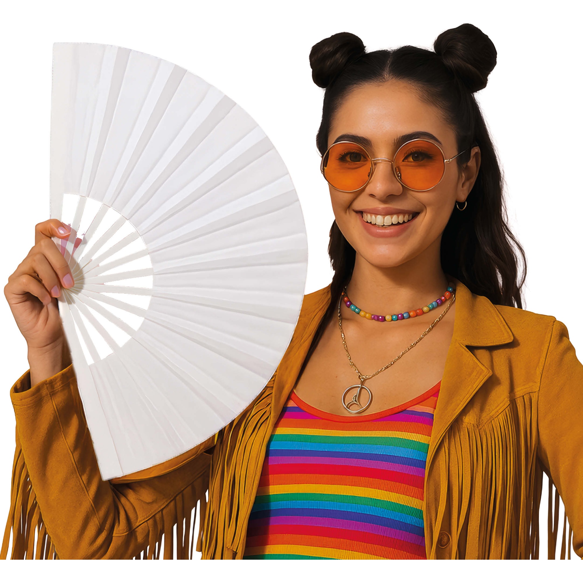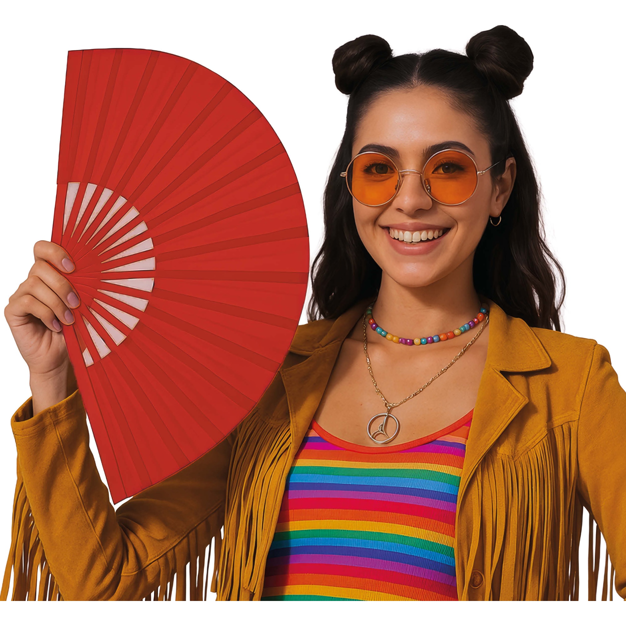 Opvouwbare stoffen waaier 60 x 30 cm. Licht en handzaam, geeft elke outfit of setting een elegante, feestelijke touch. Het opvouwbare formaat maakt transport en opslag eenvoudig. Perfect om kostuums compleet te maken, sfeer te creëren op feestjes en op te vallen tijdens fotosessies en optredens.