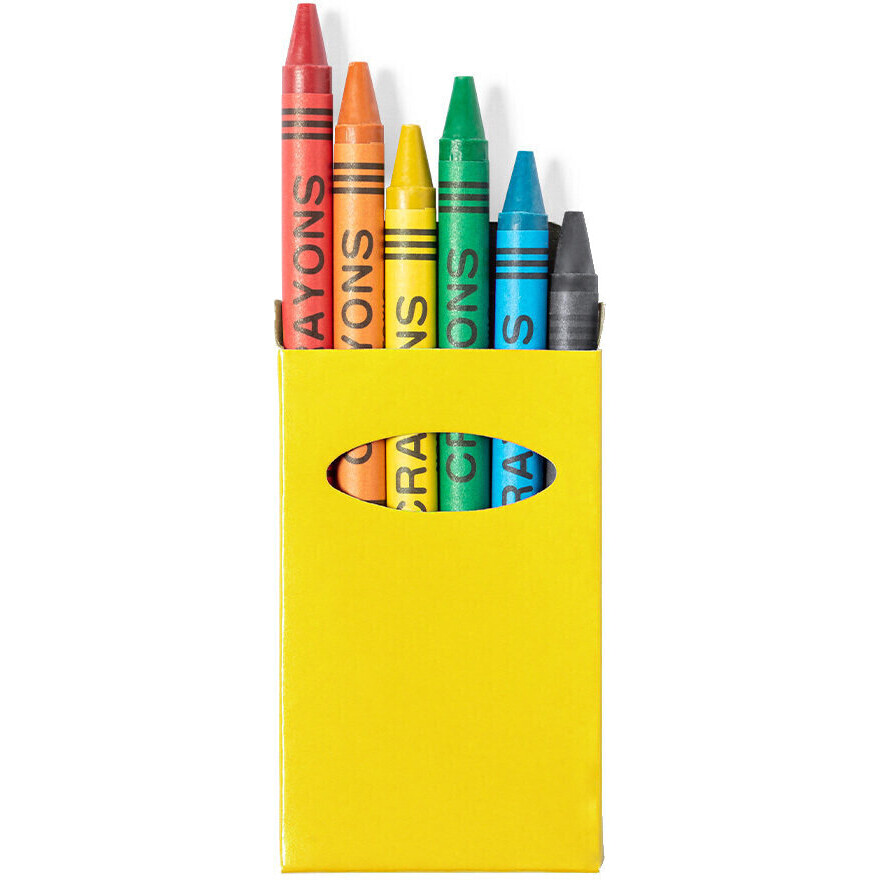 - Set van 6 waskrijtjes in een kartonnen doosje met glanzende afwerking in felle kleuren en een venster.