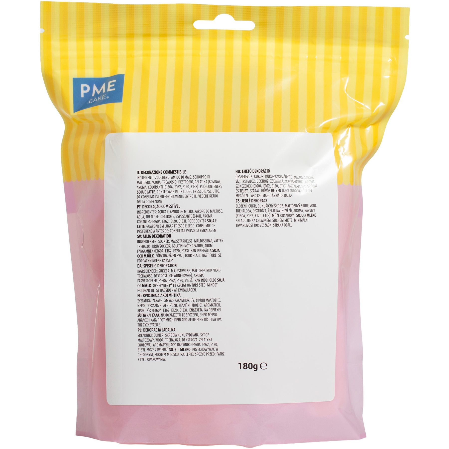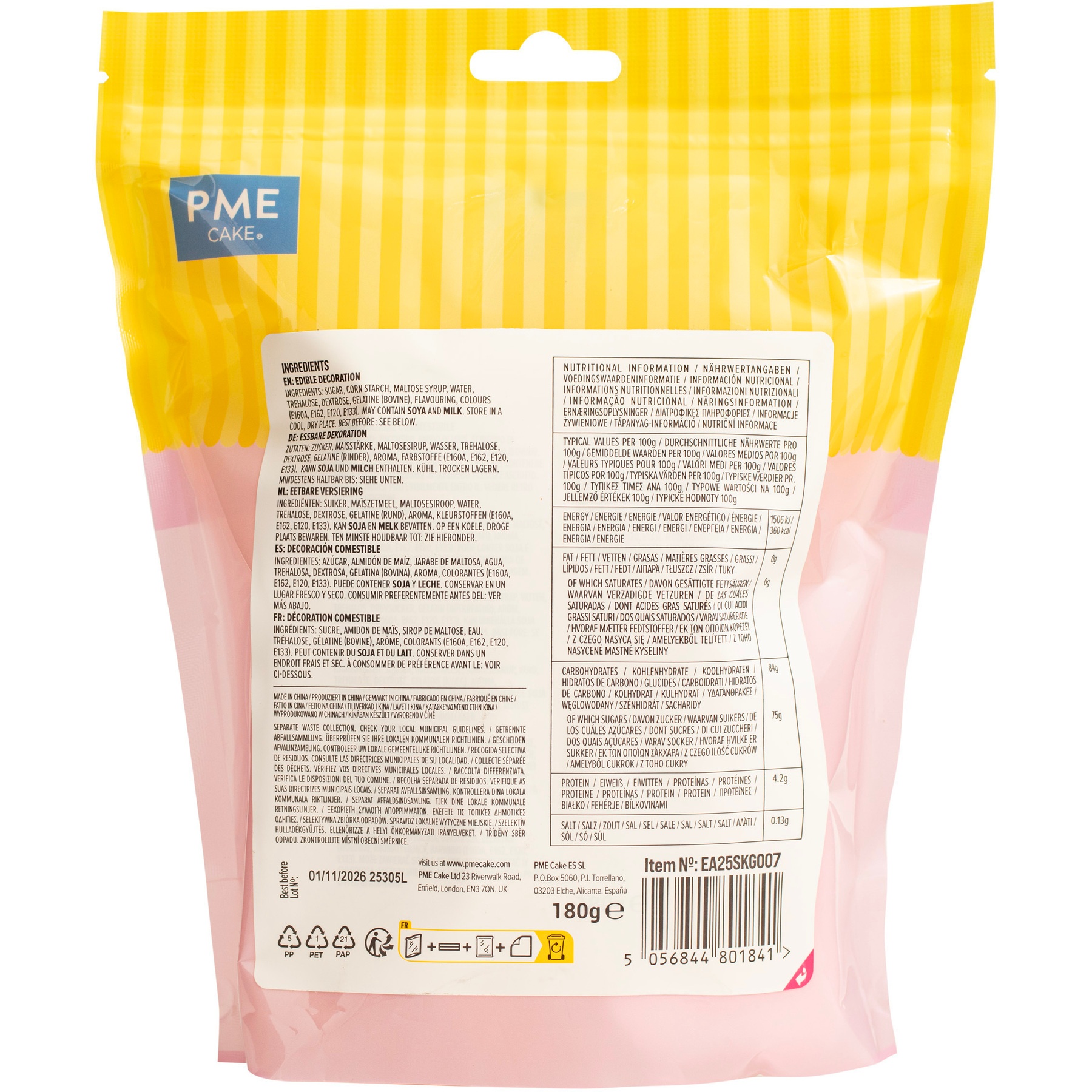 Ingrediënten: suiker, maïszetmeel, maltosesiroop, water, trehalose, dextrose, gelatine (rund), smaakstof, kleurstoffen (E160A, E162, E120, E133).