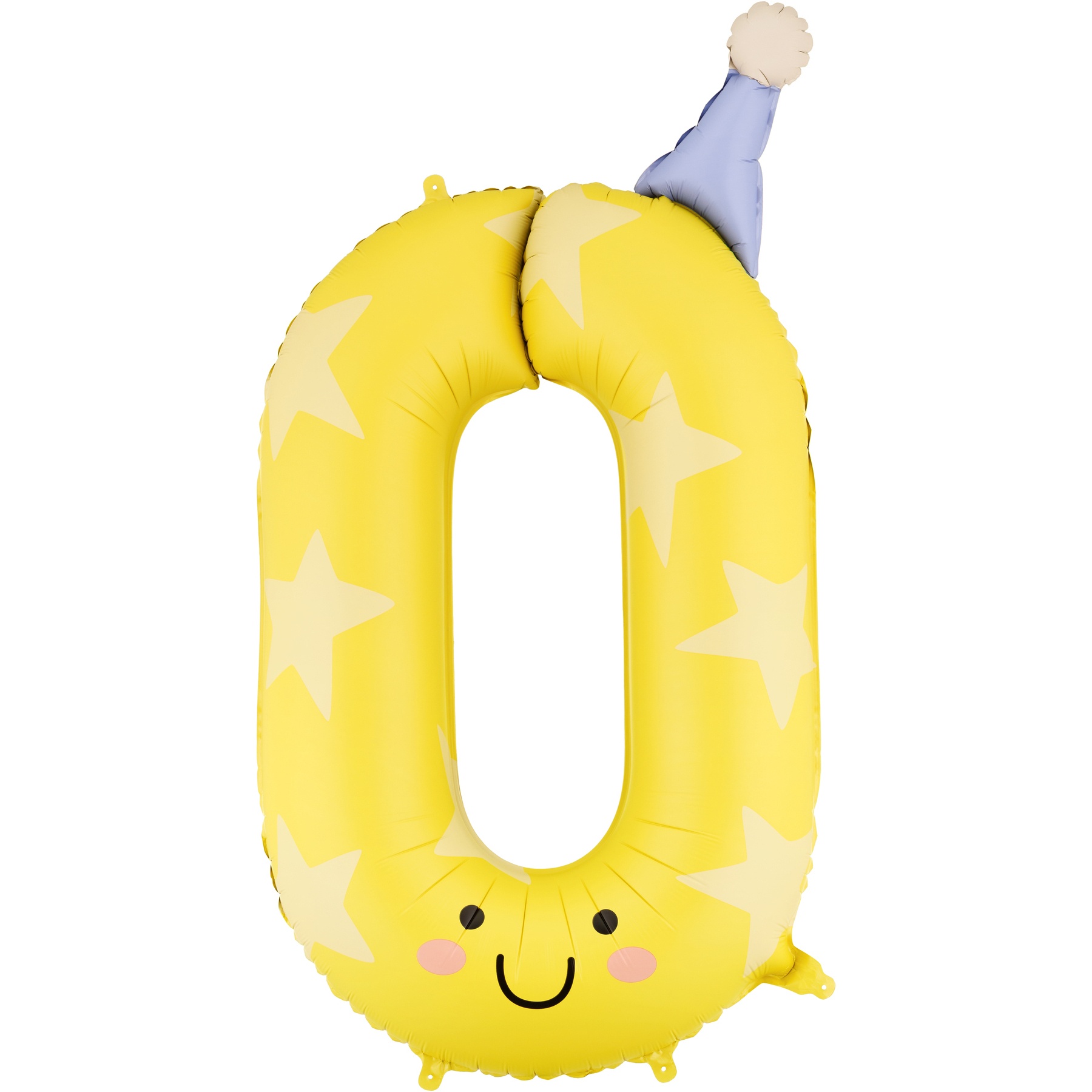 Foil-cijferballon '0' met matte afwerking, in levendig geel met een glimlachend gezichtje en een kleurrijk mutsje voor een speels en lief accent.