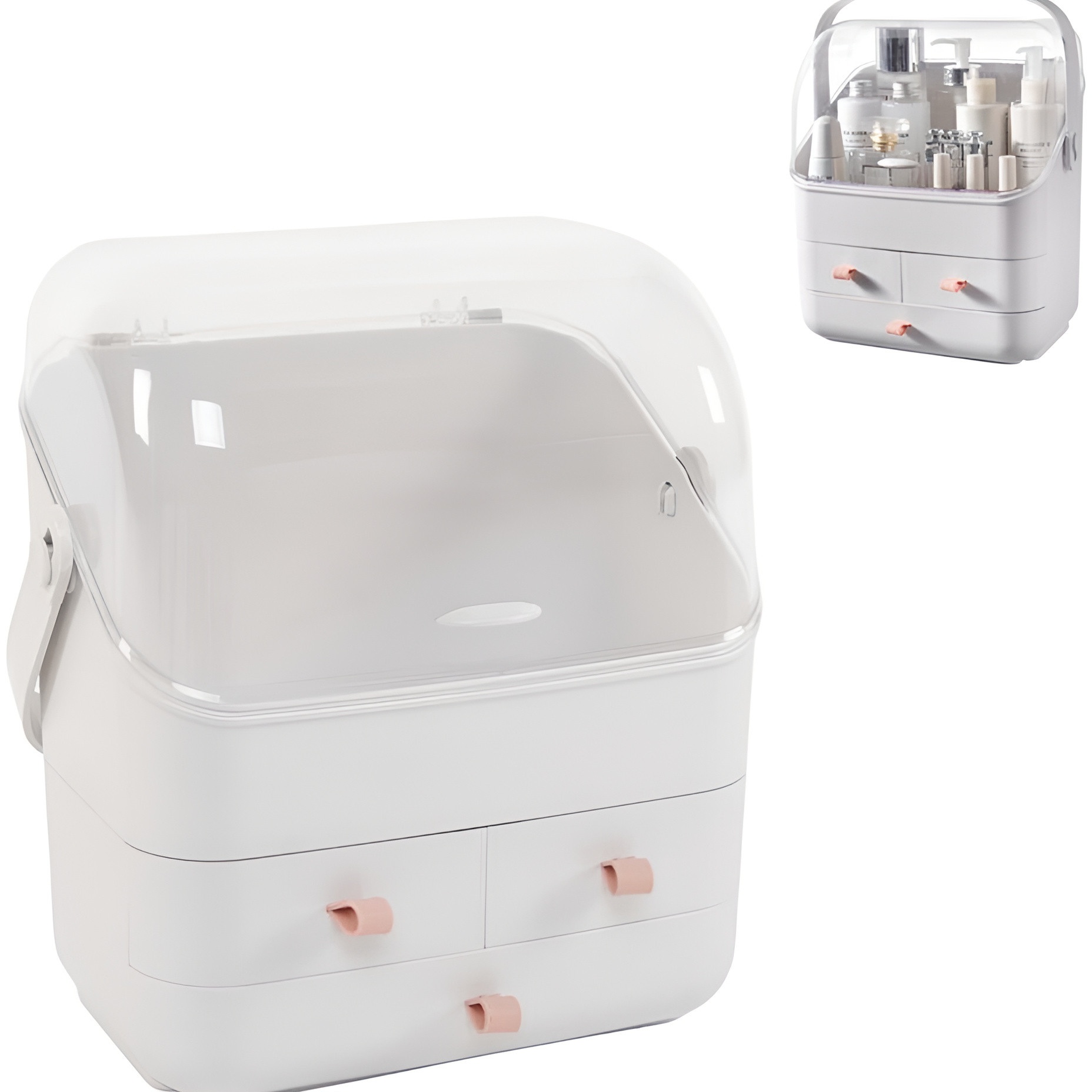 Make-up organizer ontworpen om je producten binnen handbereik en zichtbaar te houden, met een doordacht en functioneel ontwerp. De transparante stofkap maakt het mogelijk de inhoud te zien zonder te openen, terwijl de lades aparte opbergruimte bieden om alles overzichtelijk te houden. Compact en voorzien van een zijgreep voor gemakkelijk vervoer, geeft het een moderne en opgeruimde uitstraling aan je kaptafel.
