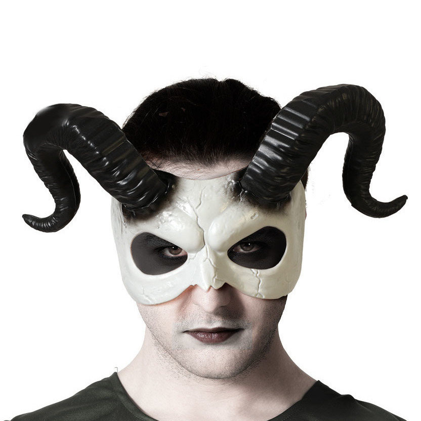 • Wit gebarsten masker met lange zwarte hoorns en een doordringende blik. Ideaal voor kostuums van een demon, magisch wezen of duistere faun.