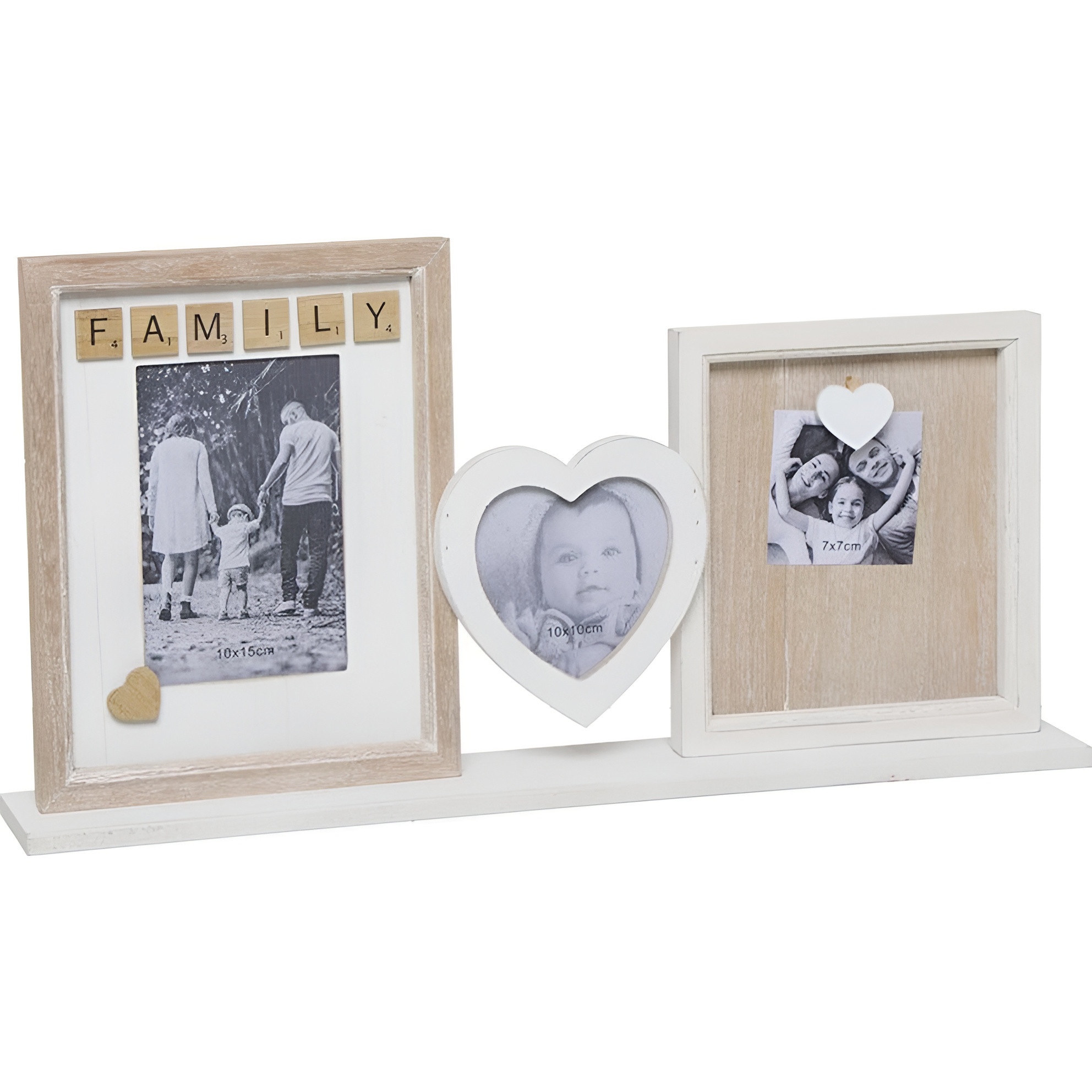 Meerdere fotolijsten in één met een familiaal design: decoratieve letters en een centraal hartje om je dierbaarste herinneringen extra te laten spreken.