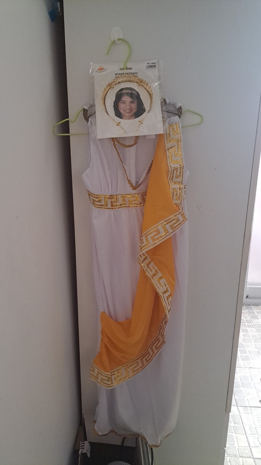 Een prachtige Romeinse keizerin jurk voor de jongste dames van het huis, bestaande uit een lange witte jurk, versierd met gouden borduursels en een mooie driehoekige vorm op de borst. Er hangt een gele mantel vanaf de schouder met borduursels die passen bij de jurk.