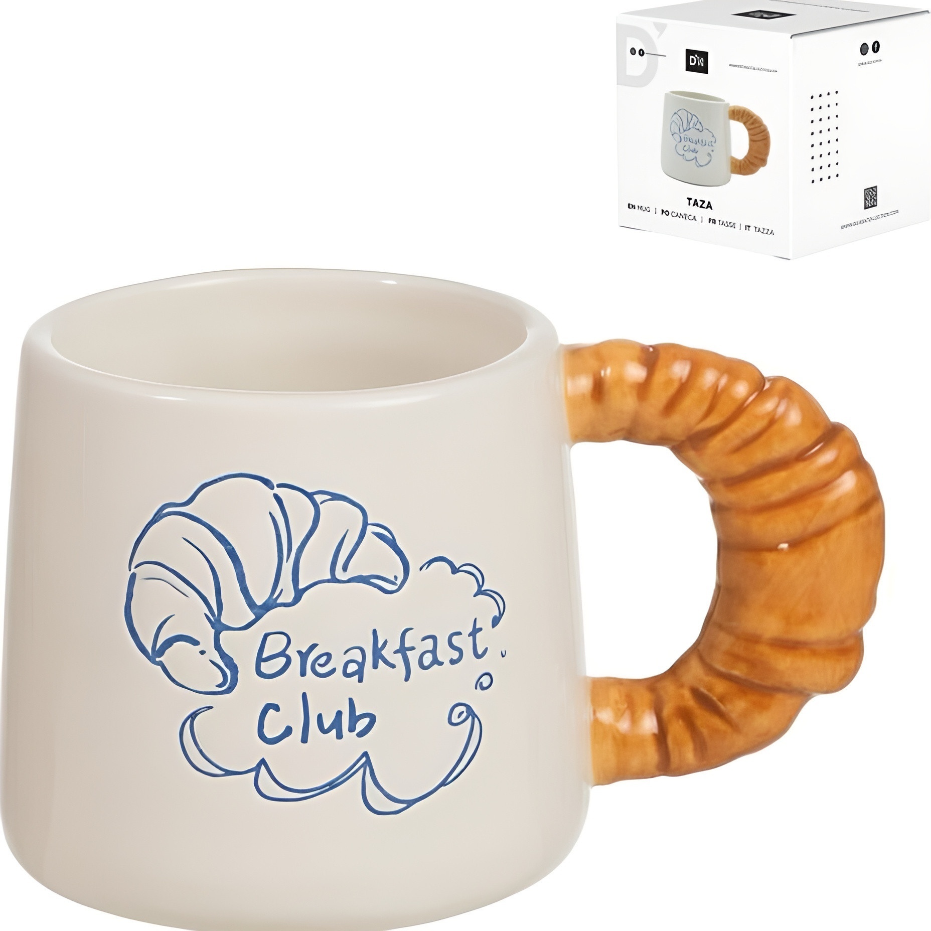 Originele ontbijtmok met een croissantvormig handvat dat je ochtenden een speels en onderscheidend accent geeft. Met een inhoud van 380 ml is hij perfect voor koffie, thee of warme chocolademelk. Het ontwerp bevat een illustratie 'Breakfast Club' die de ongedwongen, gezellige sfeer versterkt. Een opvallend serviesstuk dat ook uitstekend als cadeau werkt voor liefhebbers van patisserie en casual design.