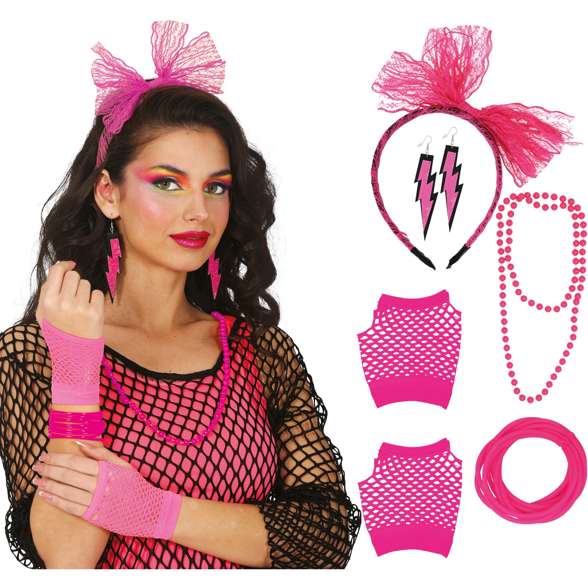 Verover de dansvloer met een kleurrijke, retrolook dankzij deze accessoireset geïnspireerd op de jaren 80. Neonkleuren en uitgesproken vormen geven een gedurfde, direct herkenbare stijl. De items zijn licht en comfortabel, ontworpen om de hele nacht te dragen zonder in te leveren op visuele impact. Perfect te combineren met jaren 80-make-up, netkleding of intense kleuren voor een authentieke uitstraling.