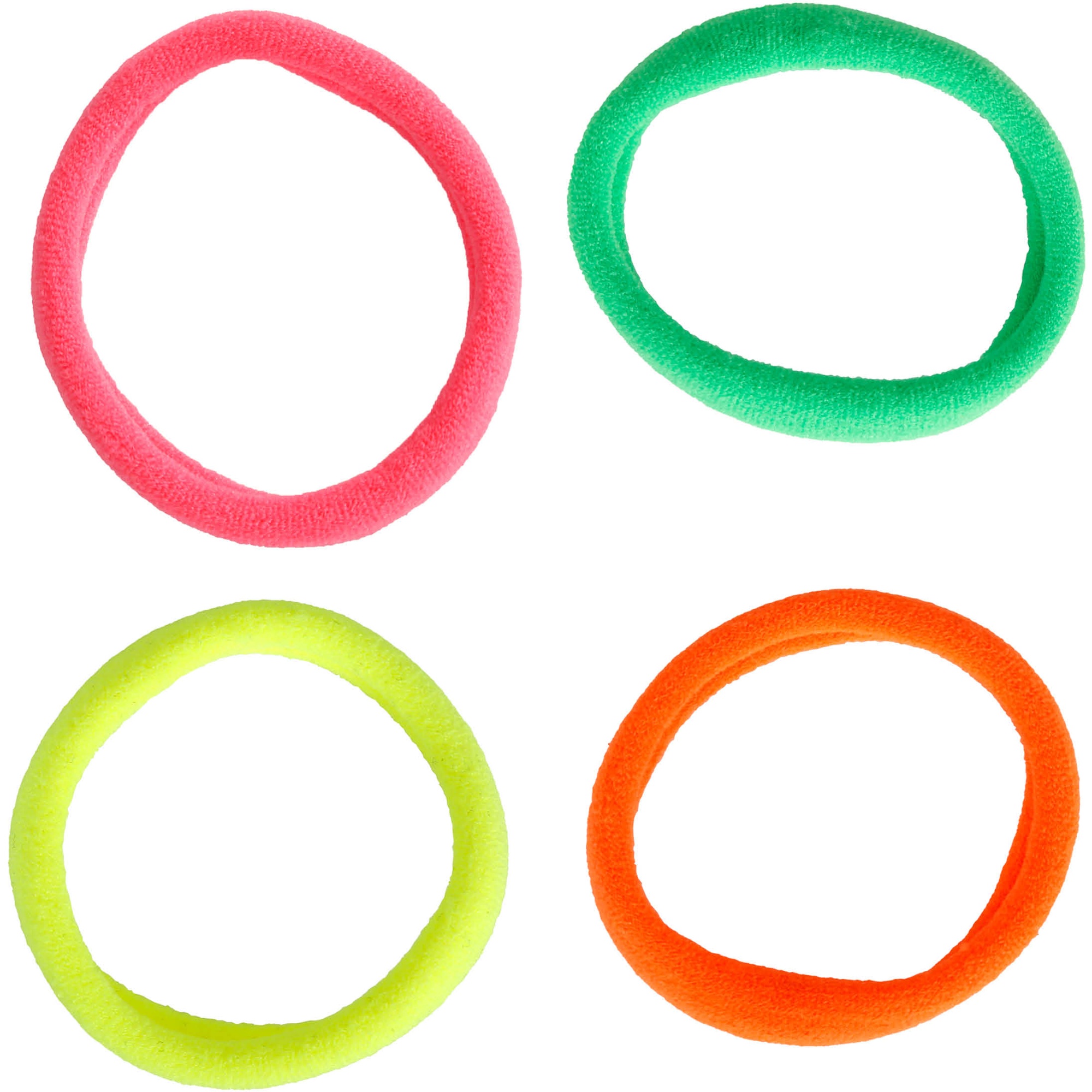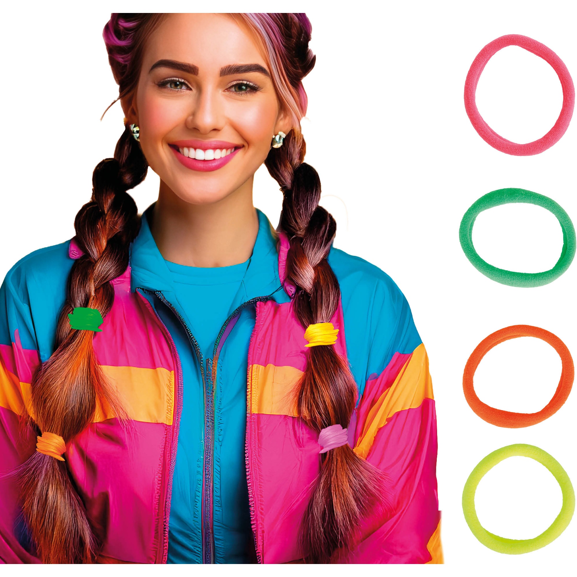 Neon haar-elastiekjes om je kapsels een speels, retroaccent te geven.