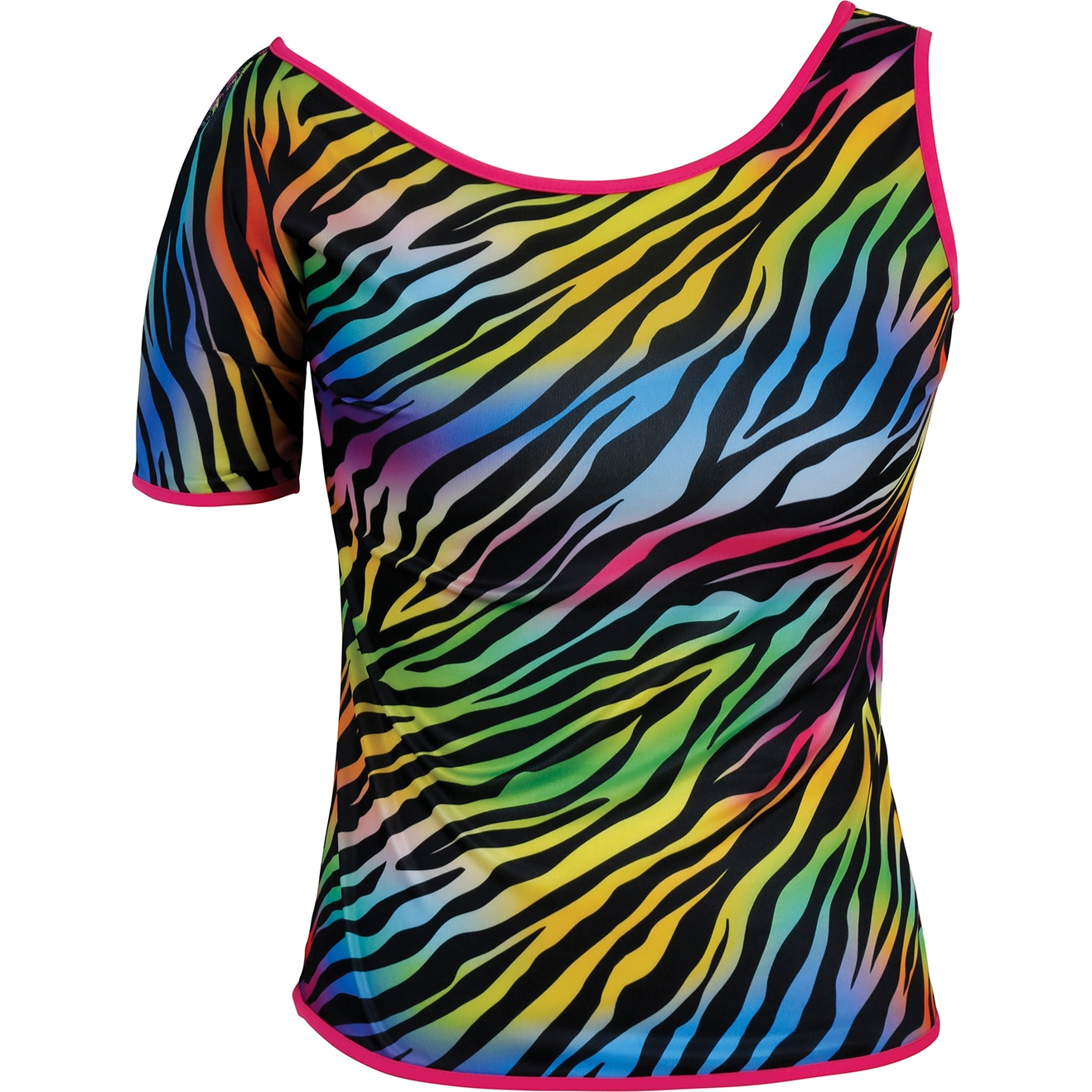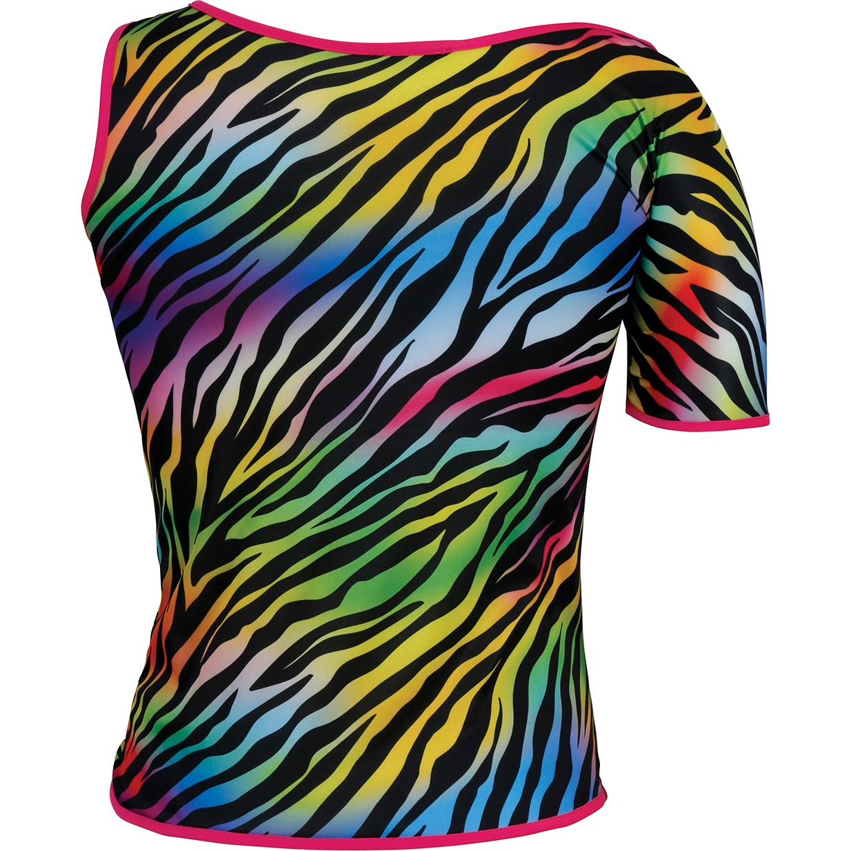 Verlicht de dansvloer met dit zebra?T?shirt in neonkleuren, geïnspireerd op de jaren 80. De levendige print en de roze bies maken het tot een opvallend item dat perfect is voor authentieke eighties?looks. Het asymmetrische decolleté en de korte mouw geven een retro en dynamische twist. Ontworpen om op te vallen en gemakkelijk te combineren met feestelijke accessoires.