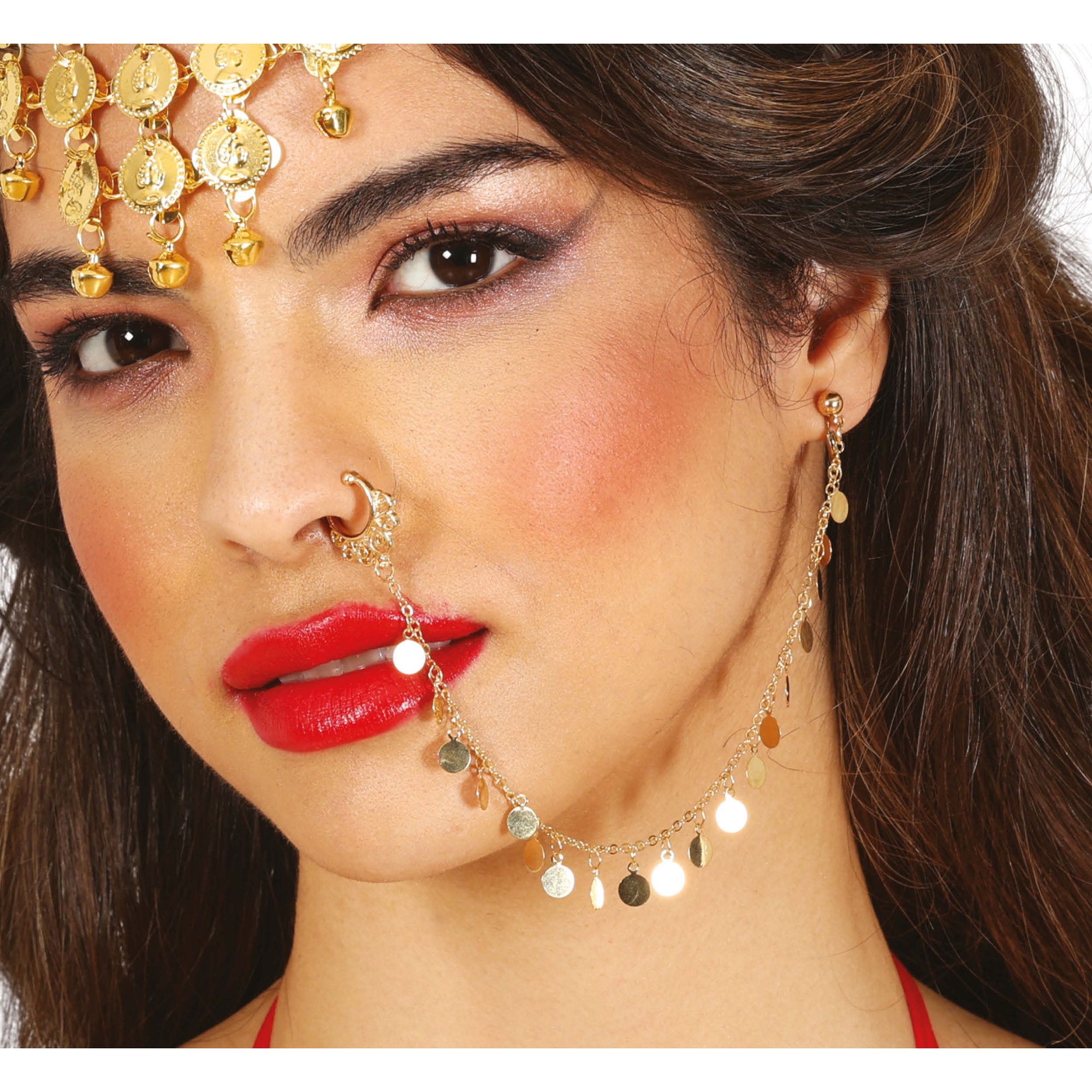 Elegante neppiercing die neus en oor verbindt met een decoratieve ketting van muntjes, perfect voor Arabische prinseslooks en Jasmine-geïnspireerde cosplay.