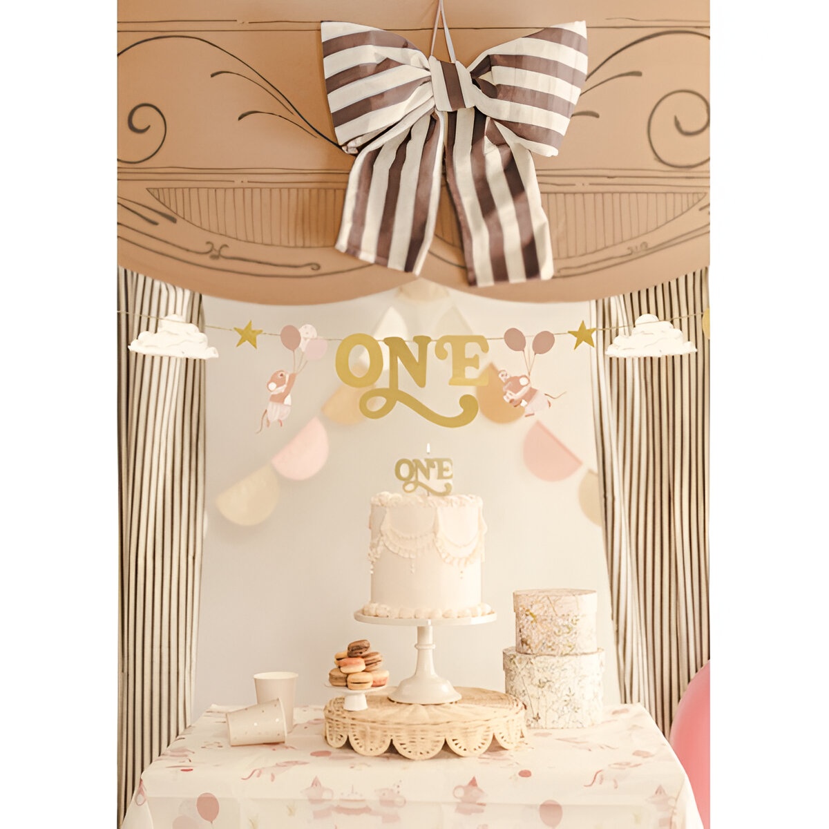 - Thema-ontwerp voor de eerste verjaardag met het woord 'ONE' en schattige muisjes.
