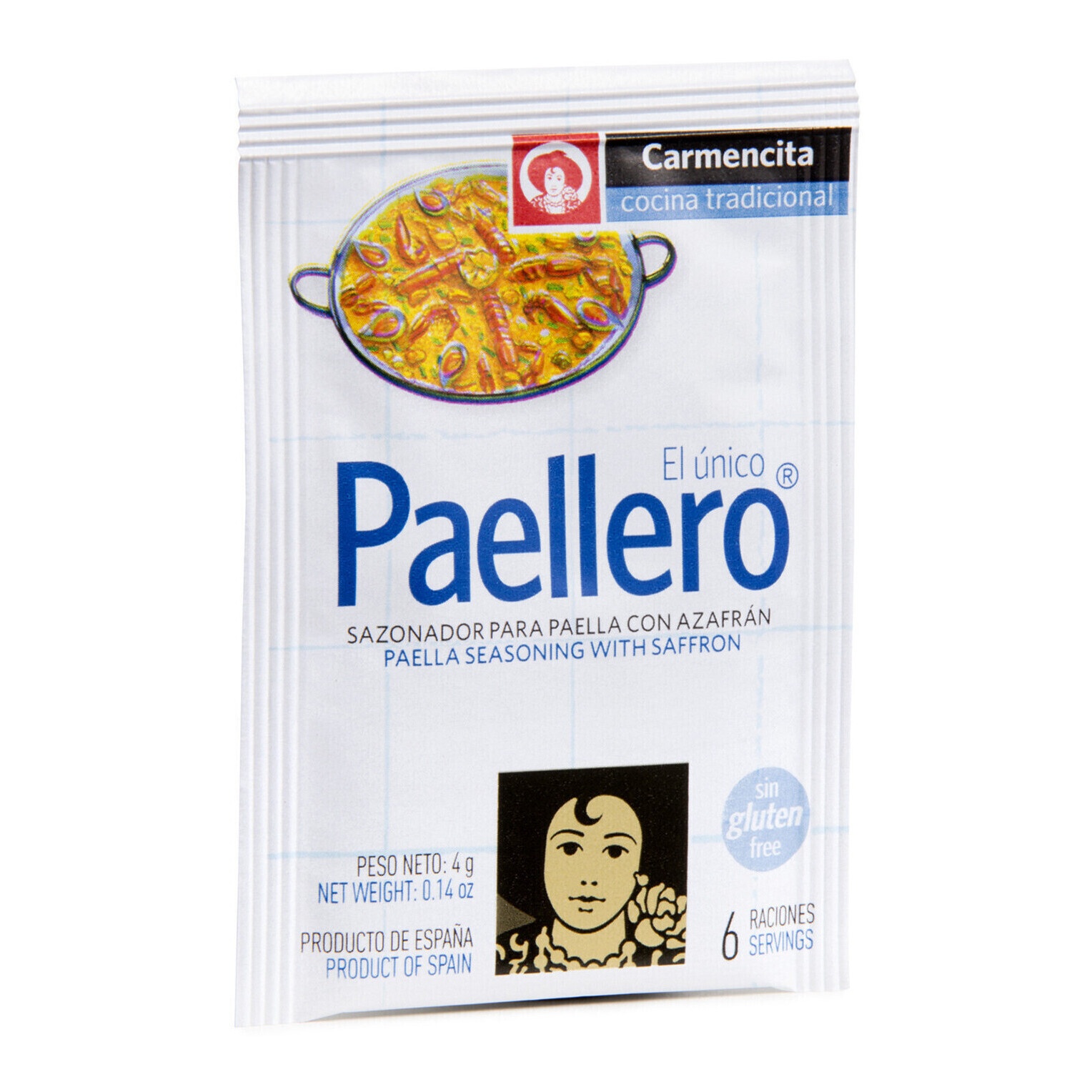 - Voordat u de rijst toevoegt, giet in de paellera de inhoud van één zakje per zes porties (600 g rijst).
