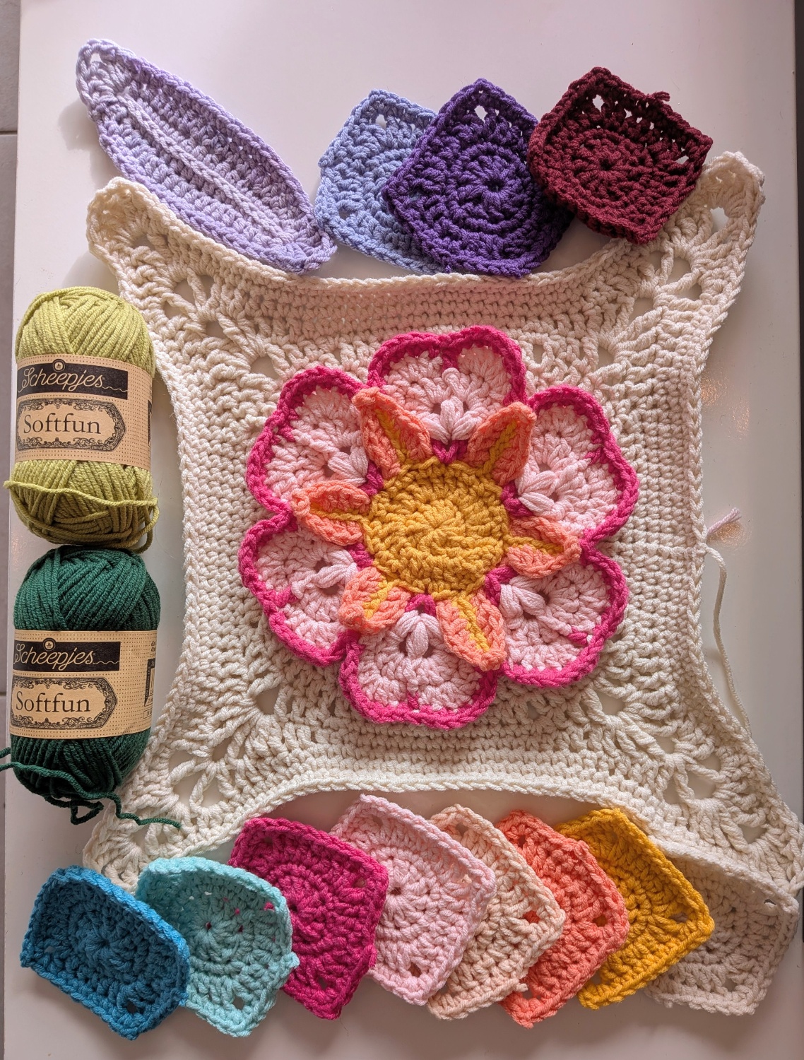 Ik gebruik Scheepies SoftFun garen om een CAL deken 'Universe in Bloom' te maken. Dit is het midden met een pedaal en kleurenpalet allemaal van SoftFun. Het garen werkt goed en heeft veel kleuropties om je kleurvoorkeuren uit te breiden. Ik heb bijna elke kleur besteld:-) Ze zijn allemaal erg levendig.