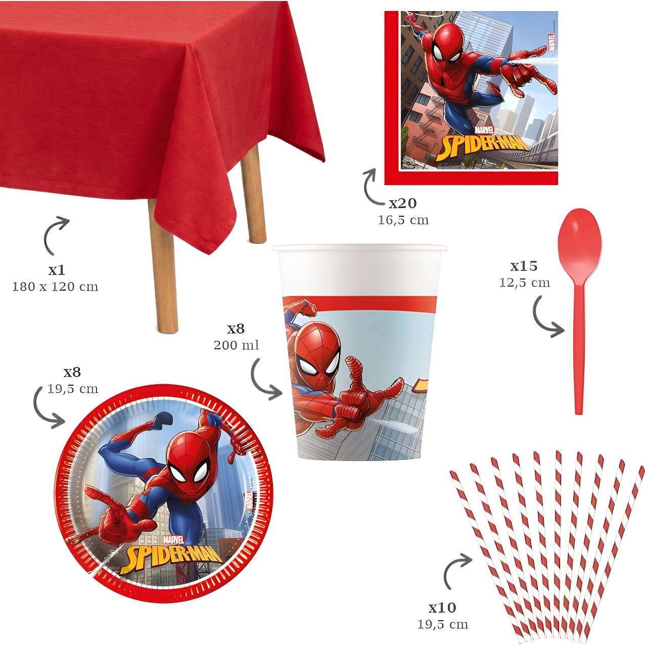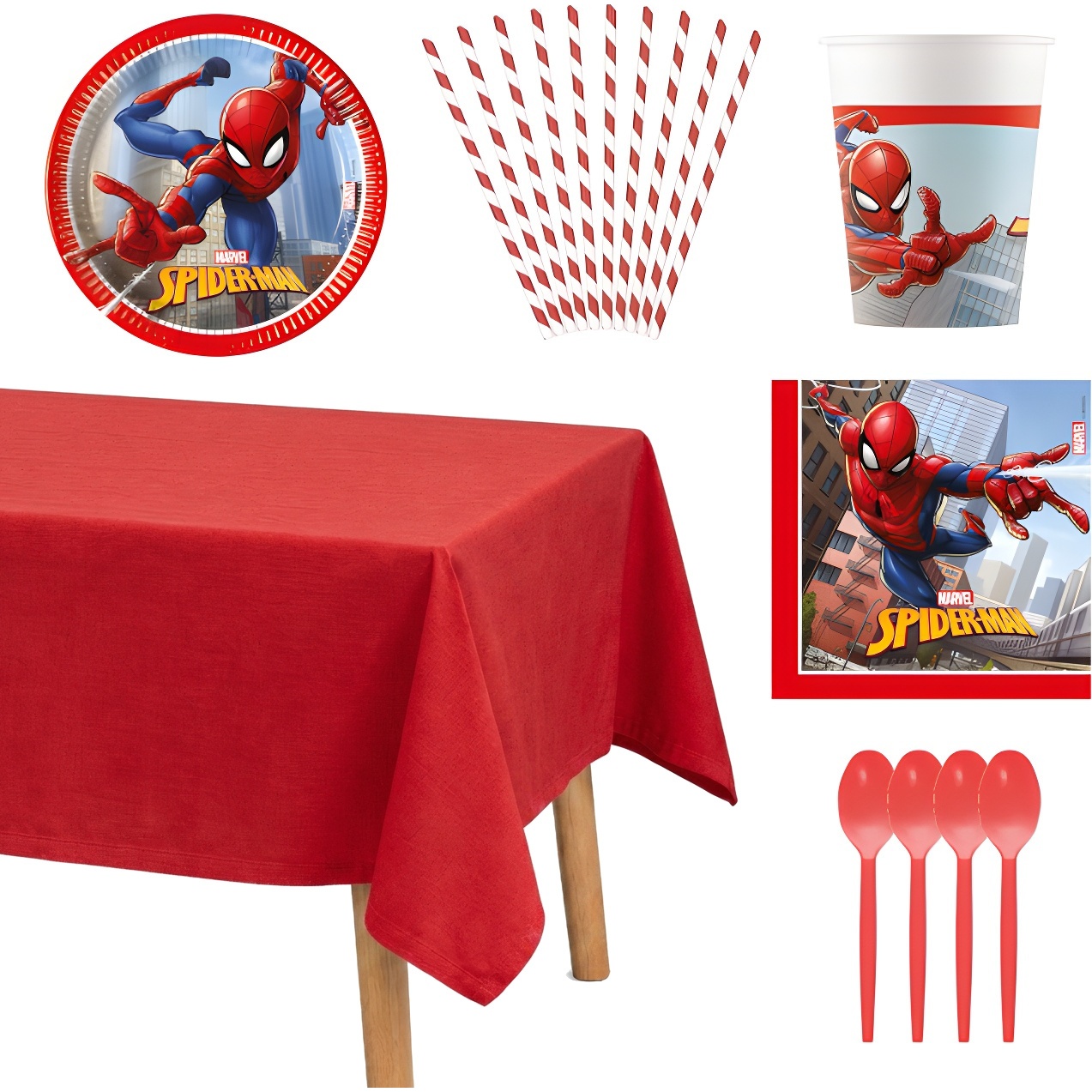 Compleet pakket met alles wat je nodig hebt om een Spiderman-themafeest te vieren.