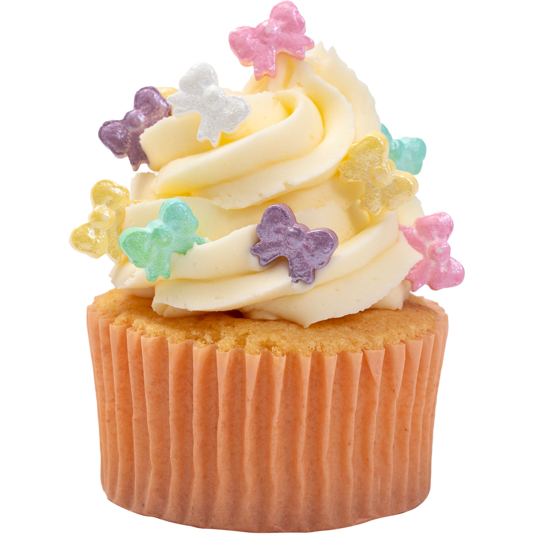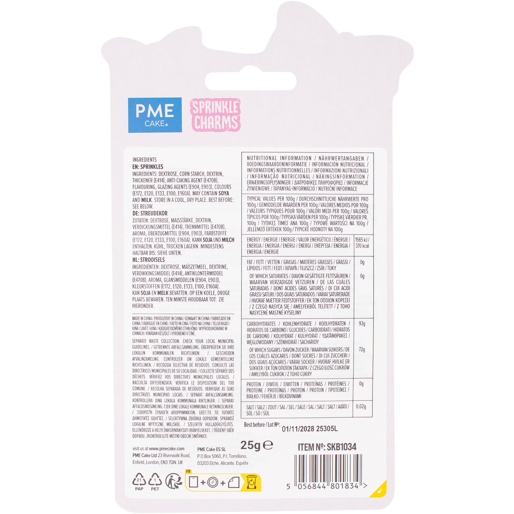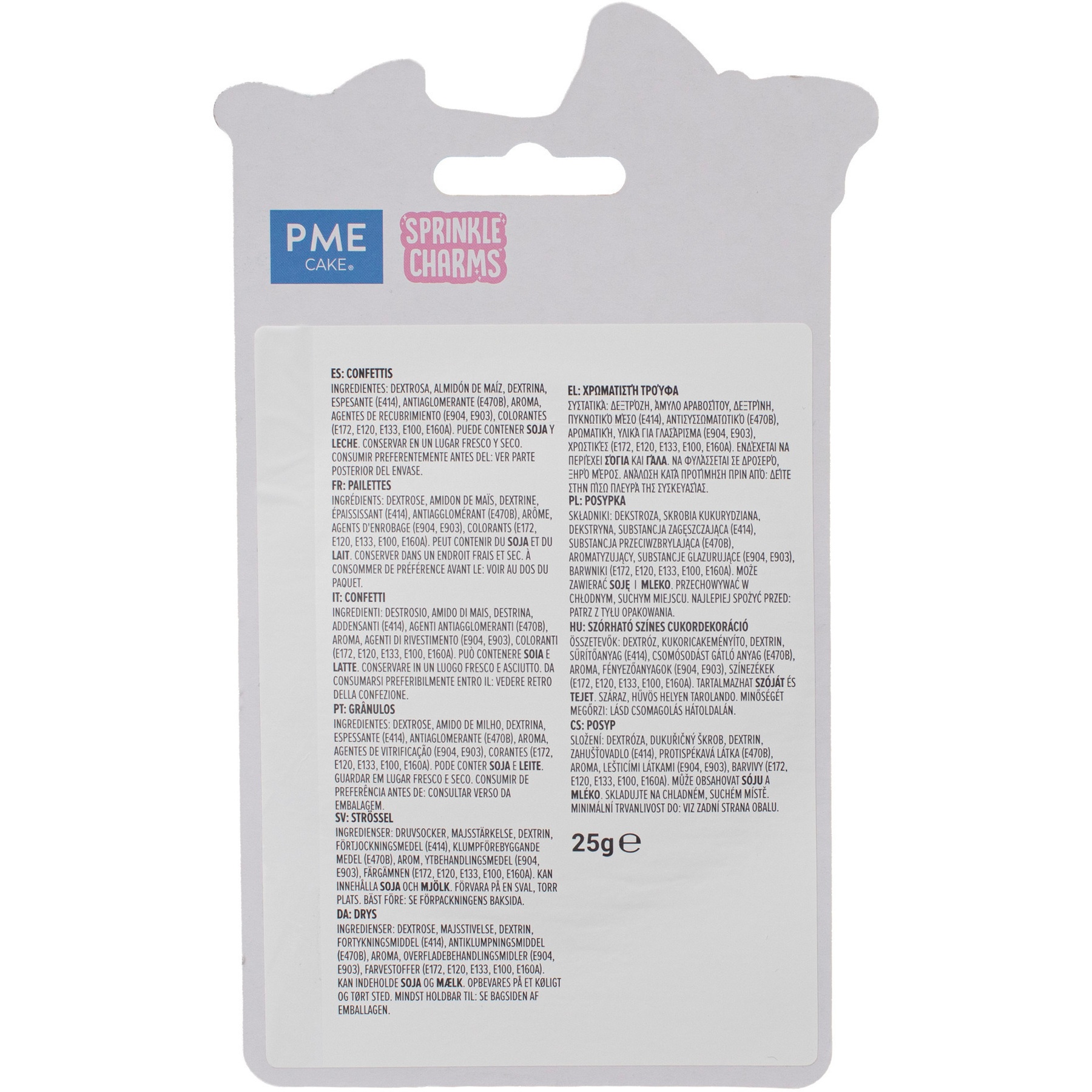 Ingrediënten: dextrose, maïszetmeel, dextrine, verdikkingsmiddel (E414), anti-klontermiddel (E470B), aroma, coatingmiddelen (E904, E903), kleurstoffen (E172, E120, E133, E100, E160A).