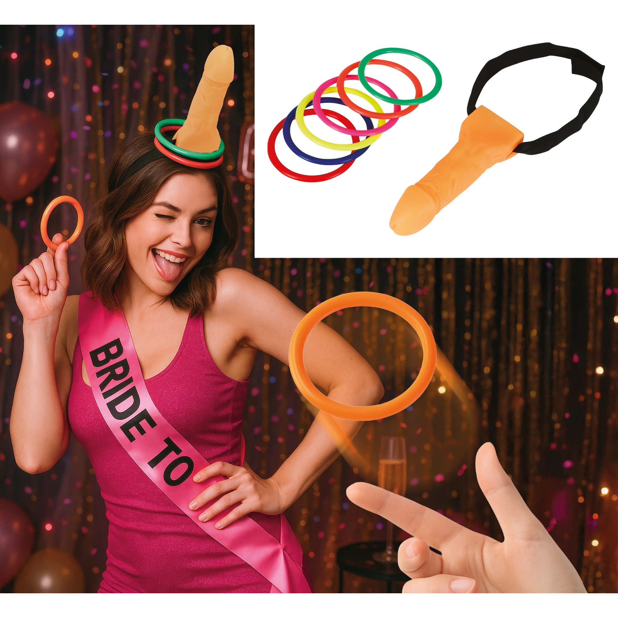 Werpspel met ondeugend en vrolijk design. Het bevat een penisvormig doel en kleurrijke ringen om op te gooien, ontworpen om sfeer te maken tijdens bijeenkomsten en vrijgezellenfeesten voor volwassenen.