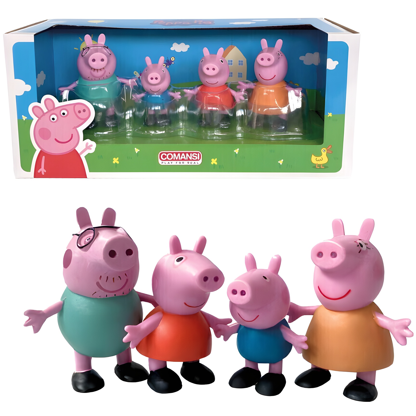Een set bestaande uit vier Peppa Pig-figuren waarmee je je taart of elke zoete tafel kunt versieren.