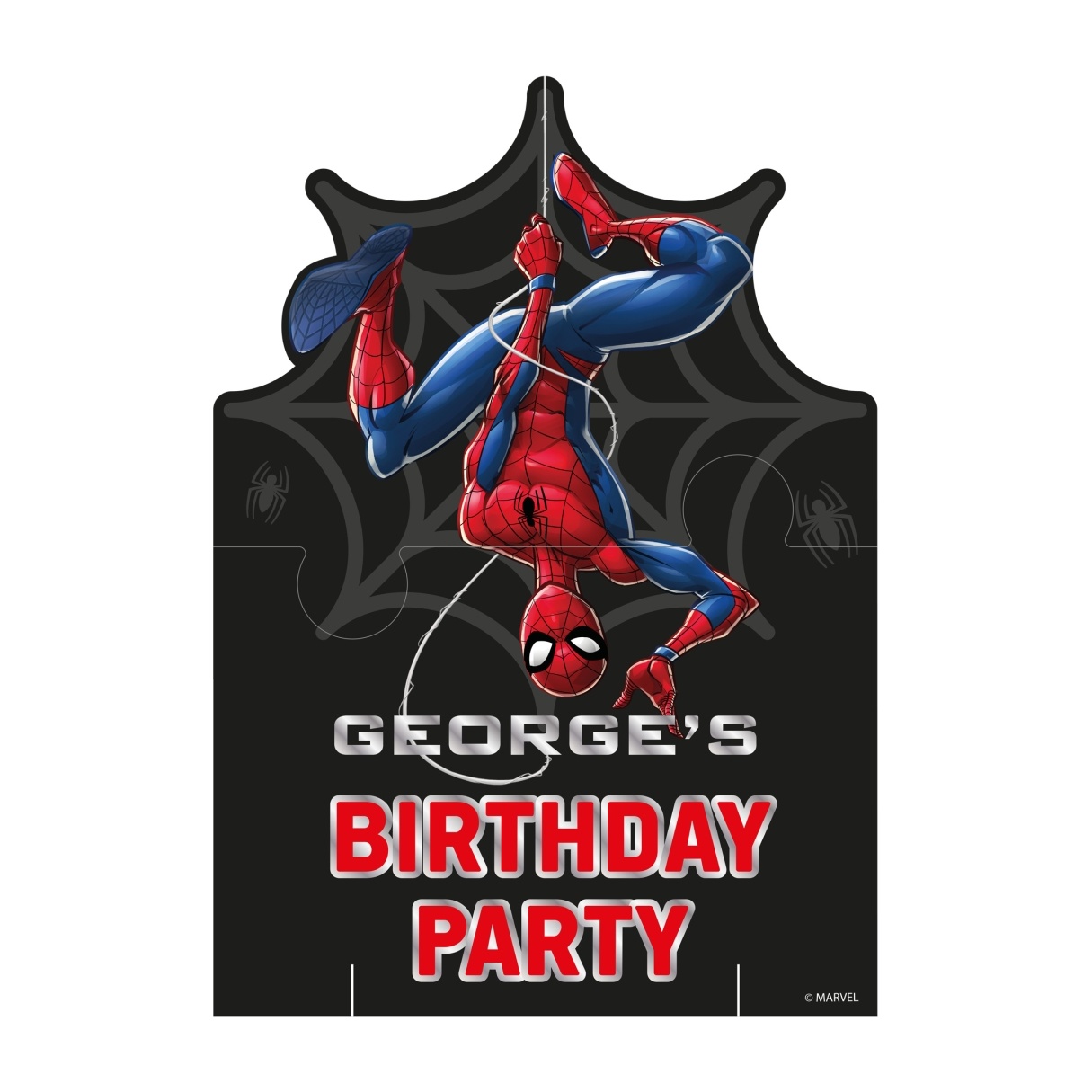 Personaliseerbaar Spiderman-bord, ontworpen om kinderfeestjes een heroïsche touch te geven.
