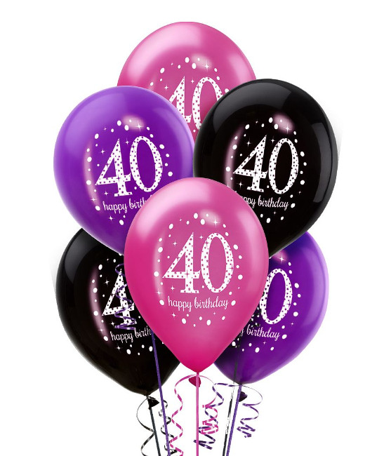Pakket met een assortiment latex ballonnen in zwart, paars en fuchsia, met nummeropdruk in wit. Perfect om je feestruimte mee te decoreren.