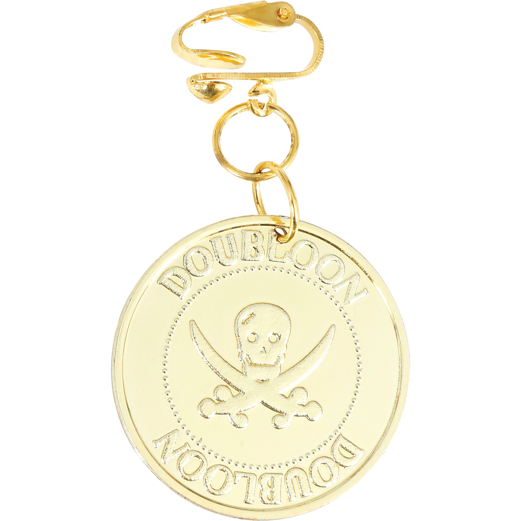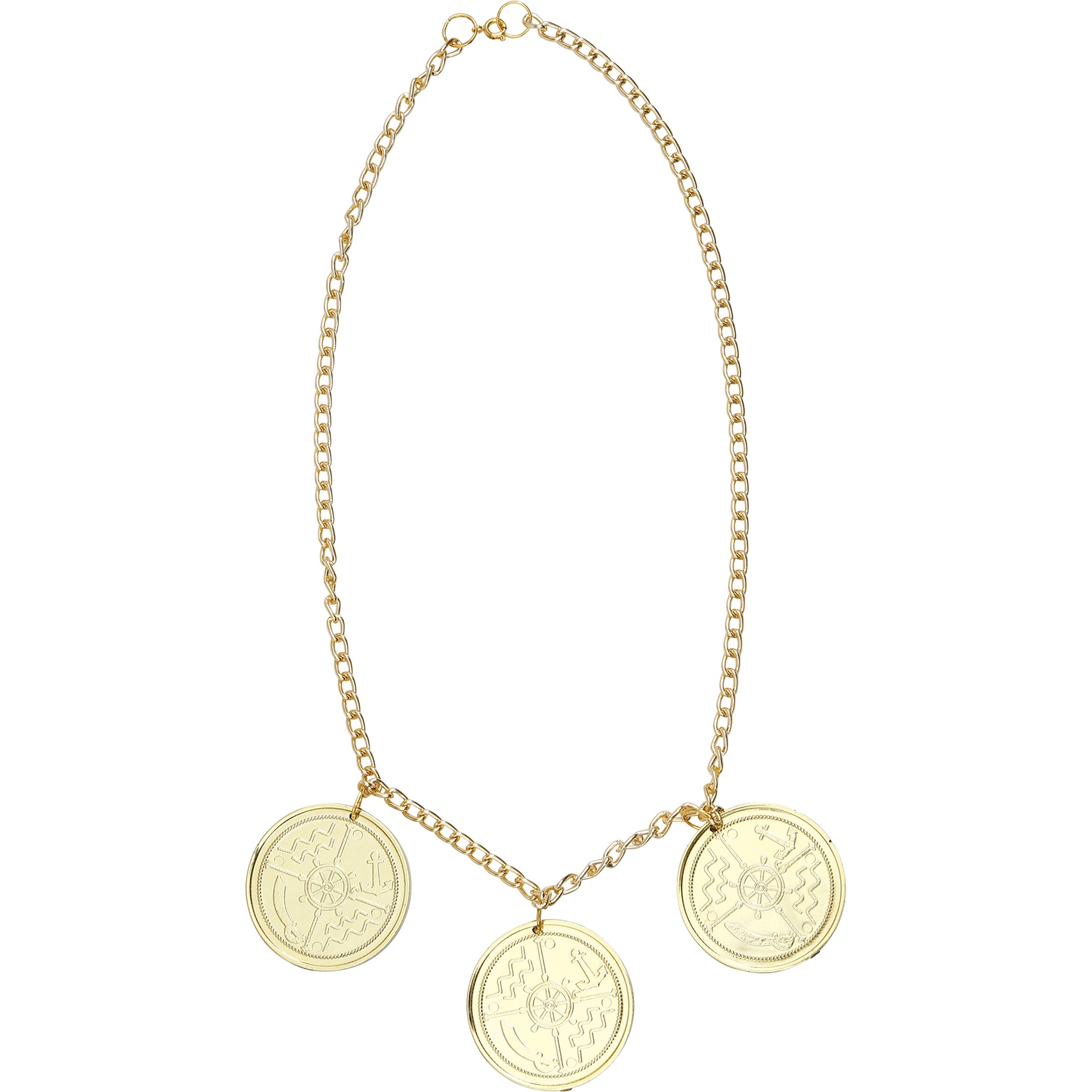 Set van ketting en oorbellen met piratenmunten, ontworpen voor volwassen dames. Heeft een goudkleurige afwerking die oude munten imiteert en een theatraal, opvallend accent aan je outfit geeft. Gemaakt van licht PVC zodat je het comfortabel kunt dragen tijdens feestjes en evenementen. Ideaal voor Carnaval en themafeesten; geeft karakter aan elke piratenoutfit en is eenvoudig te combineren met hoeden, blouses en andere kostuumaccessoires.