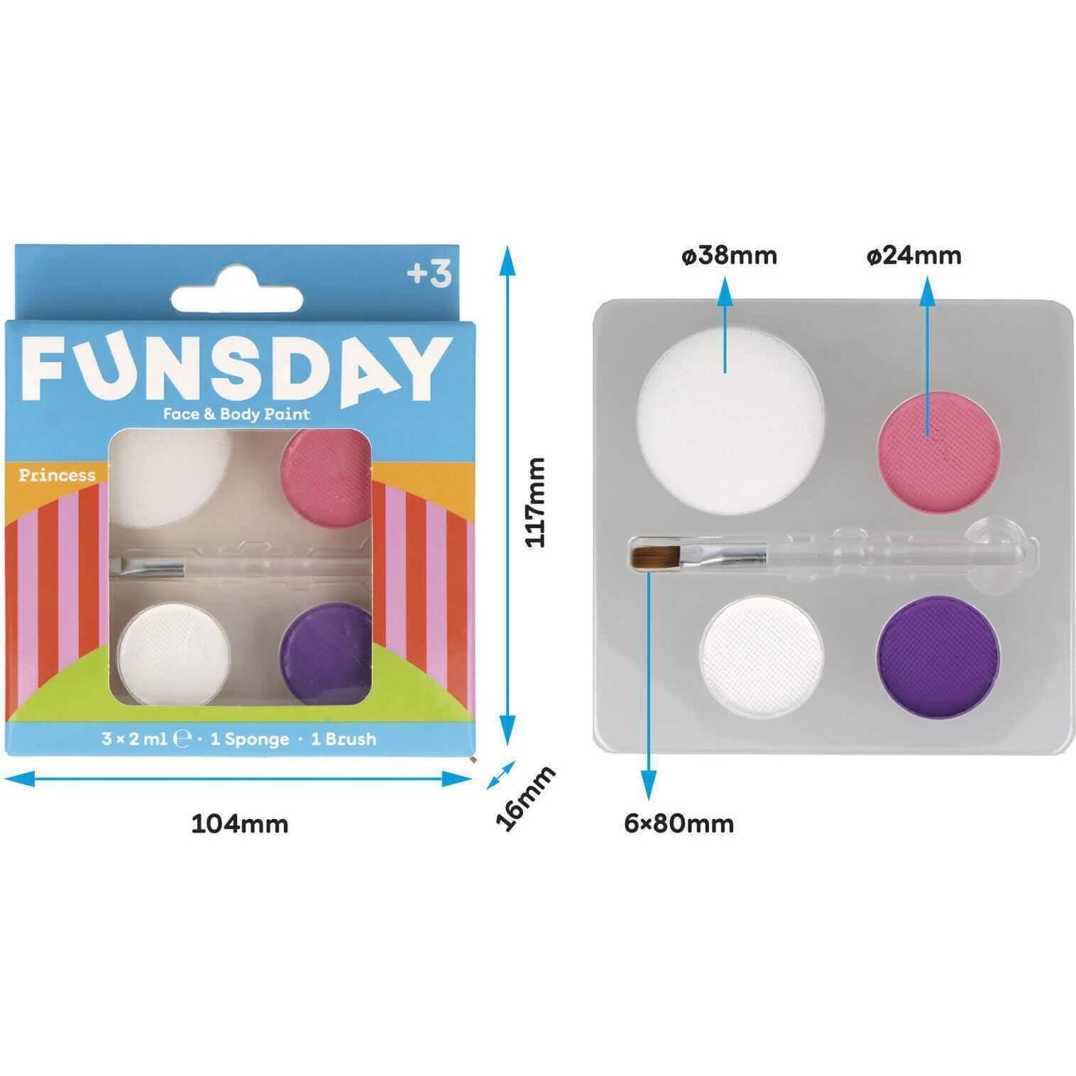 - Set van 3 schminkkleuren in prinsessentinten (lila, wit en roze) inclusief kwast en spons. Makkelijk aan te brengen met levendige, langdurige resultaten. Ideaal voor verkleedpartijtjes, feestjes, festivals, carnaval of Halloween.