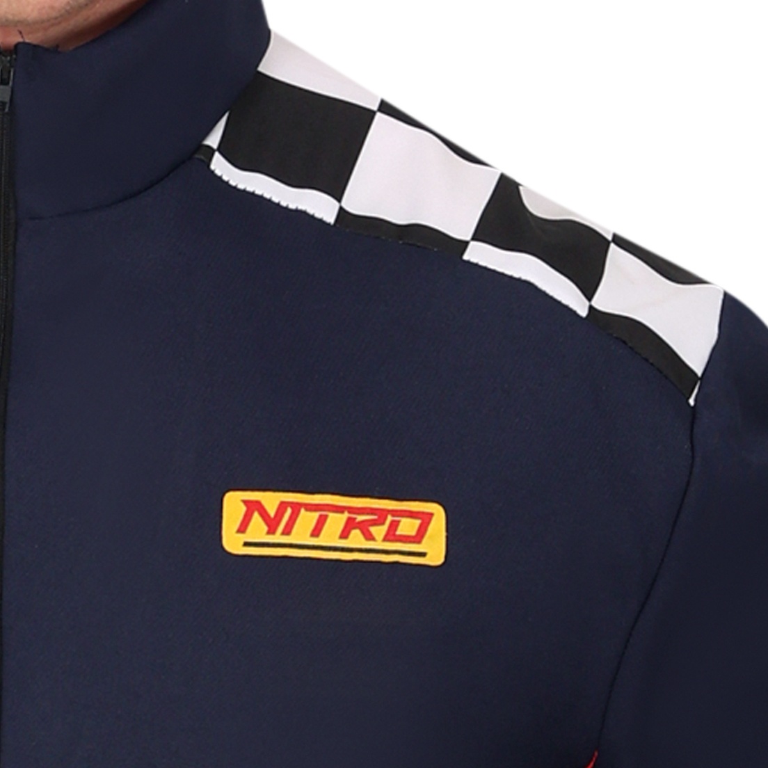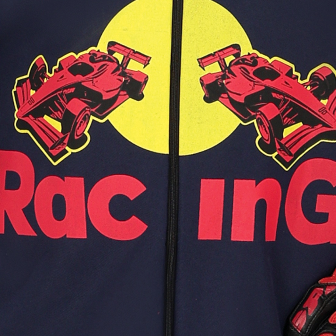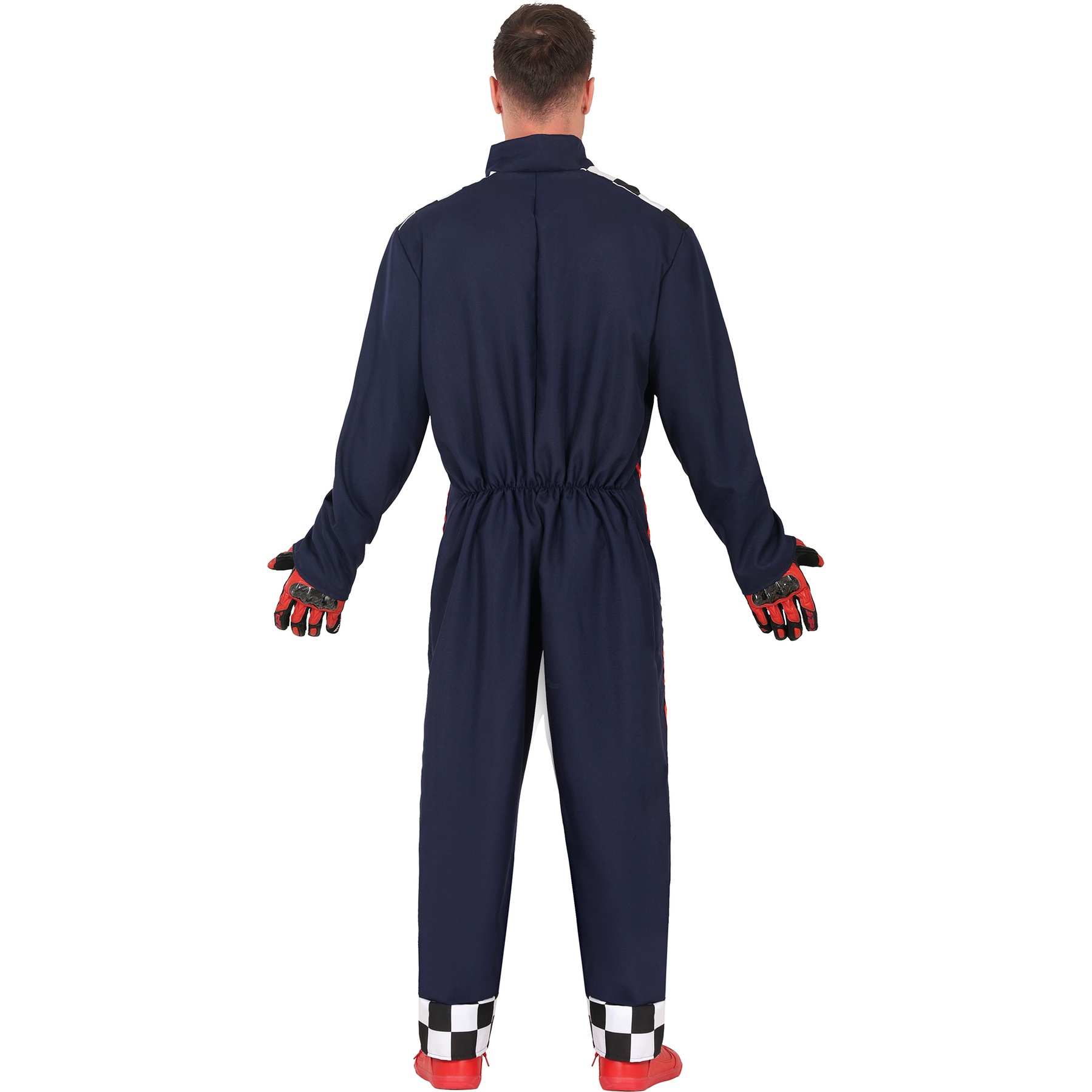 Racepiloot kostuum voor heren. Het betreft een overall met lange mouwen die aan de voorkant met een rits wordt gesloten.