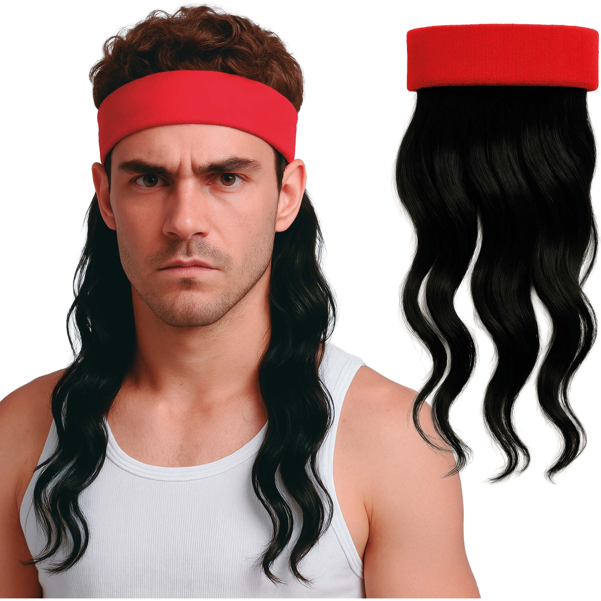 Rambo-stijl pruik, ontworpen om volwassen outfits een retro en strijdlustige uitstraling te geven. Voorzien van lang, golvend haar in donkerbruin en een geïntegreerde rode hoofdband die het iconische kapsel nabootst. Gemaakt van synthetische polyestervezels voor een egale, opvallende look. Één maat voor volwassenen, eenvoudig aan te trekken en comfortabel te dragen op feestjes en evenementen.