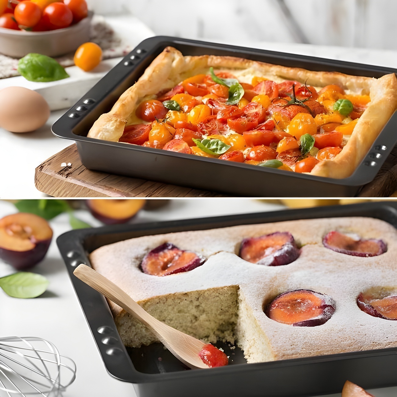 Ideale vorm voor zowel zoete als hartige recepten. De kleine gaten in de handgrepen van de vorm stellen je in staat om een andere erop te plaatsen en deze als deksel te gebruiken.