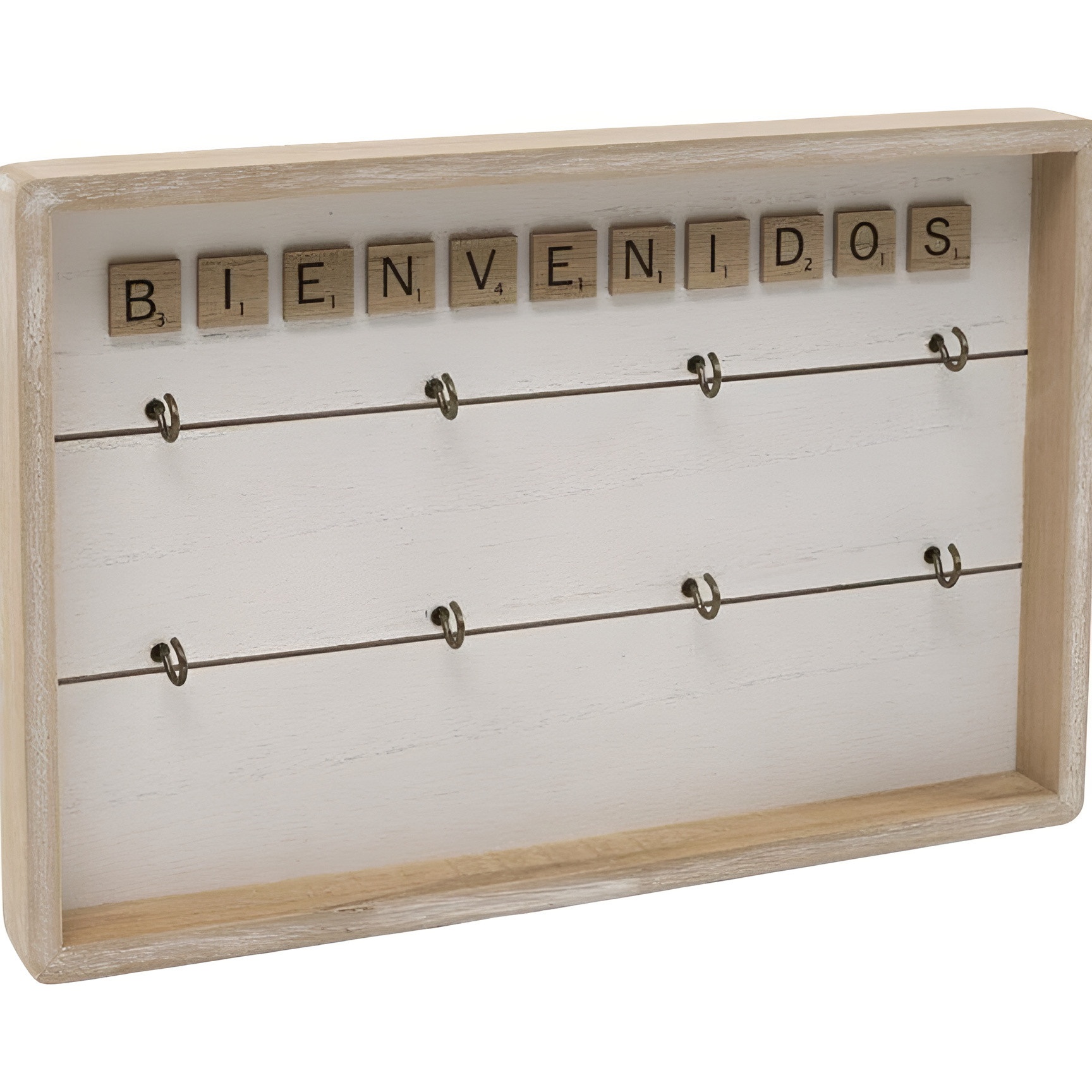 Een decoratieve sleutelhouder die functionaliteit en stijl combineert voor in de hal. Met het opschrift "Bienvenidos" dat warmte en karakter aan de entree toevoegt. Ontworpen om sleutels netjes en binnen handbereik te houden - ideaal voor gezinnen en gasten.