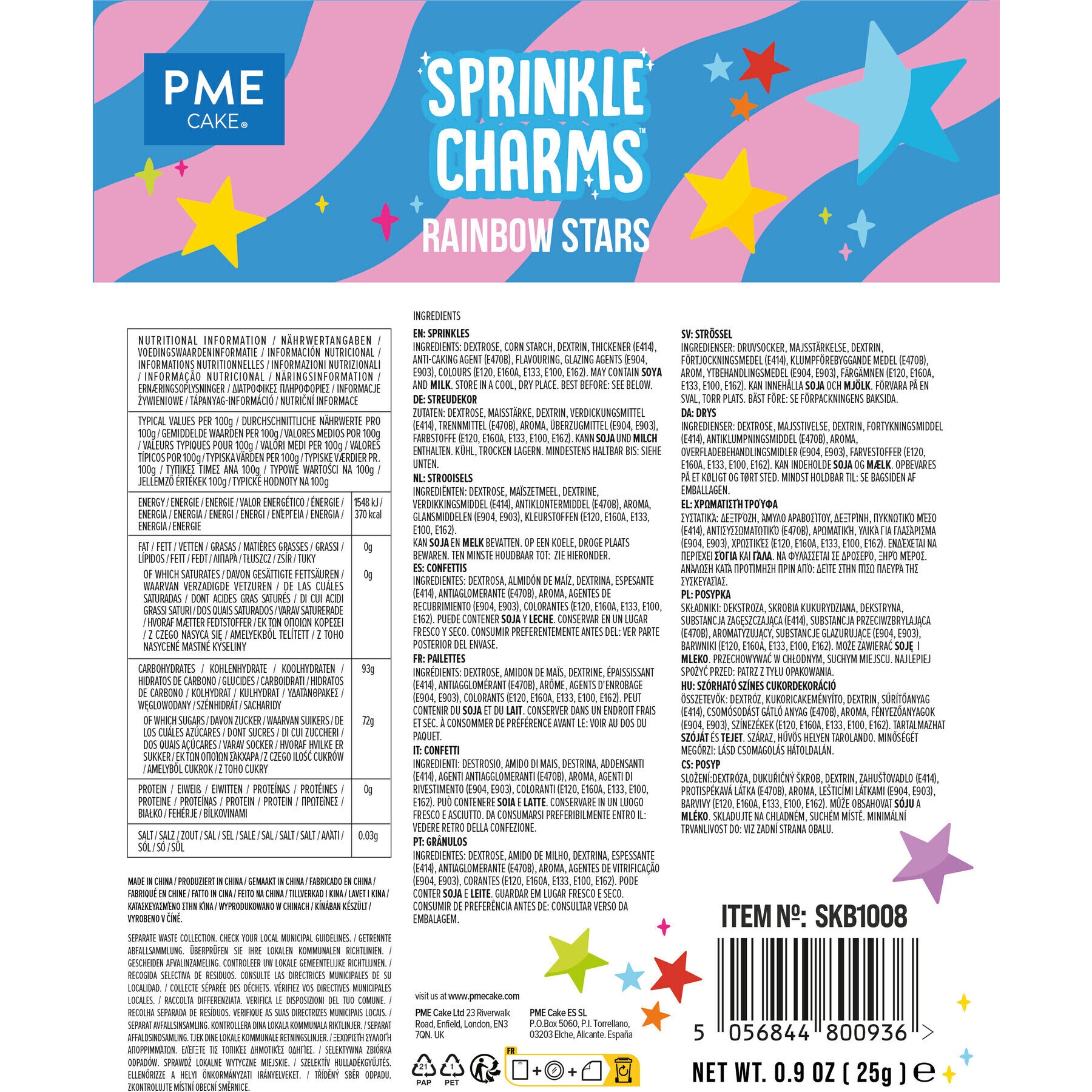Ingrediënten: dextrose, maïszetmeel, dextrine, verdikkingsmiddel (E414), antiklontermiddel (E470B), aroma, glansmiddelen (E904, E903), kleurstof (E120, E160A, E133, E100, E162).