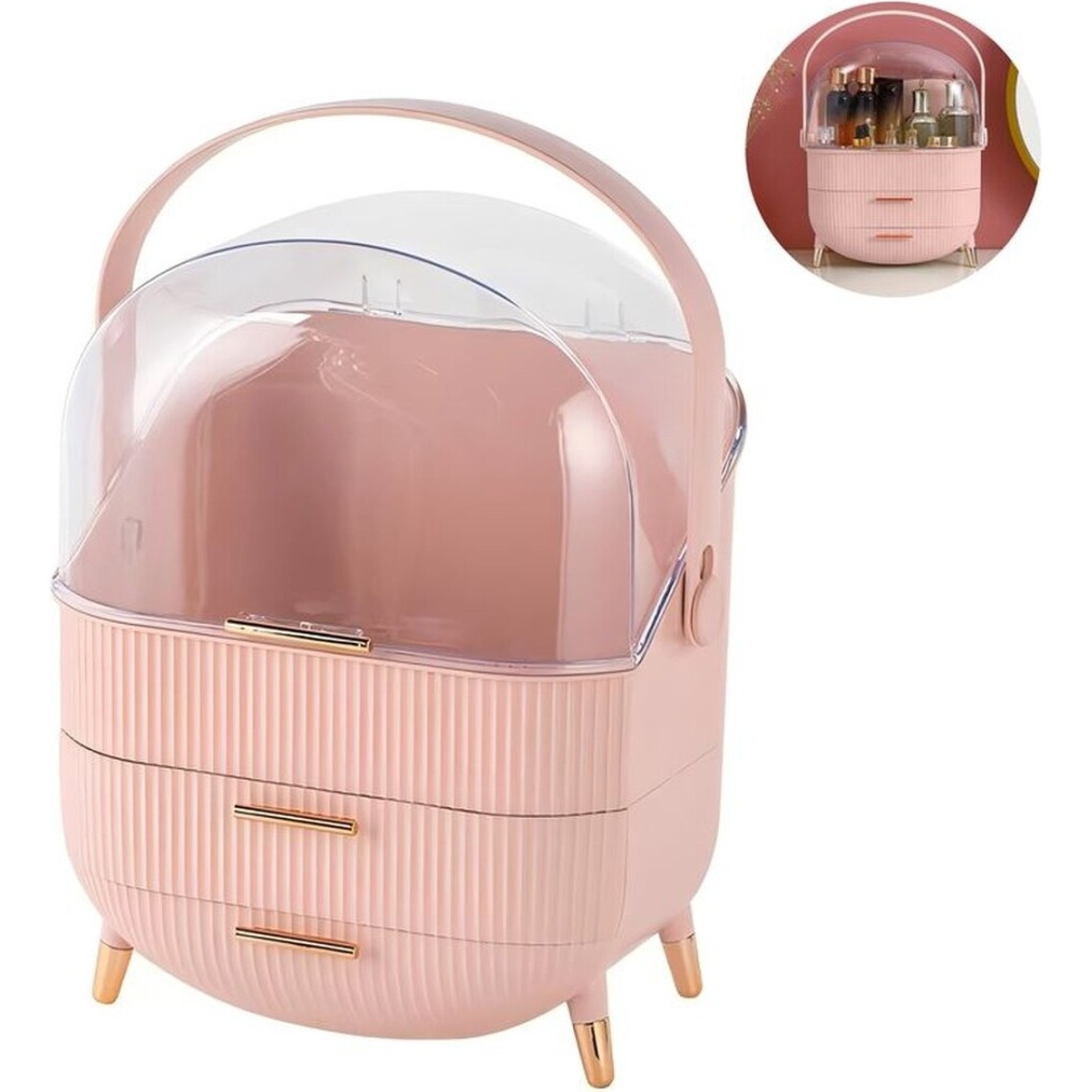 Roze draagbare make-up organizer met transparant deksel en elegant design. Ideaal om make-up en accessoires geordend en altijd zichtbaar te houden.