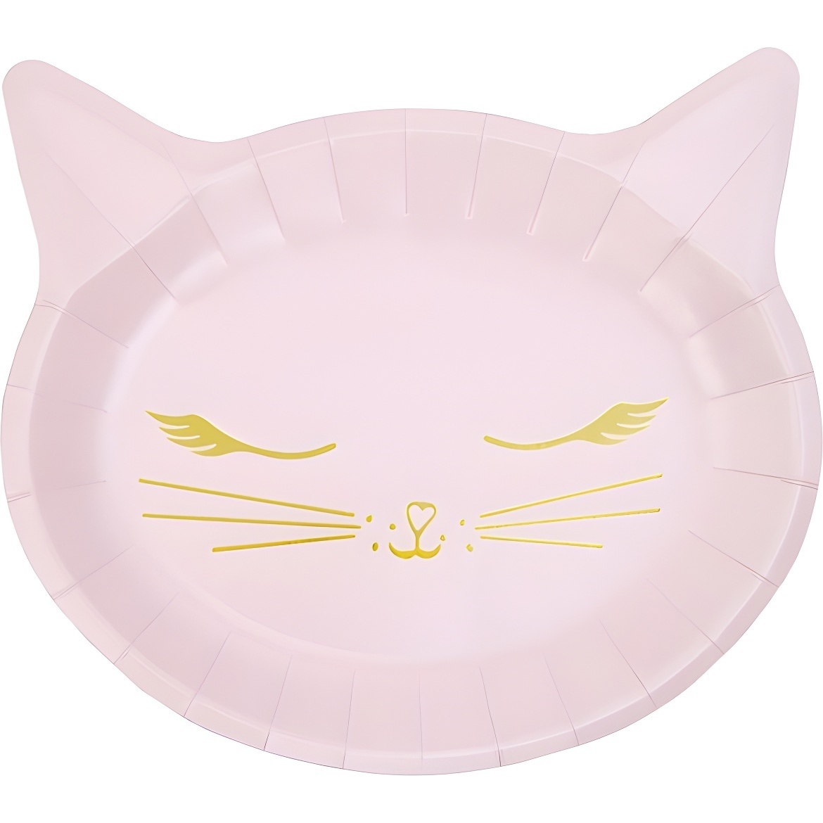 Roze Kattengezicht Bordjes met Gouden Snorharen 20 x 22 cm - 6 Stuks