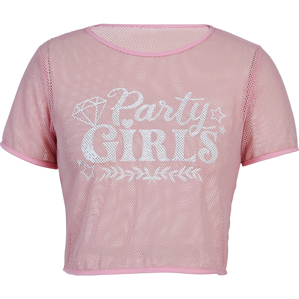 - Roze cropped mesh-top met "Party Girls"-opdruk voor een feestelijke, vrouwelijke look.