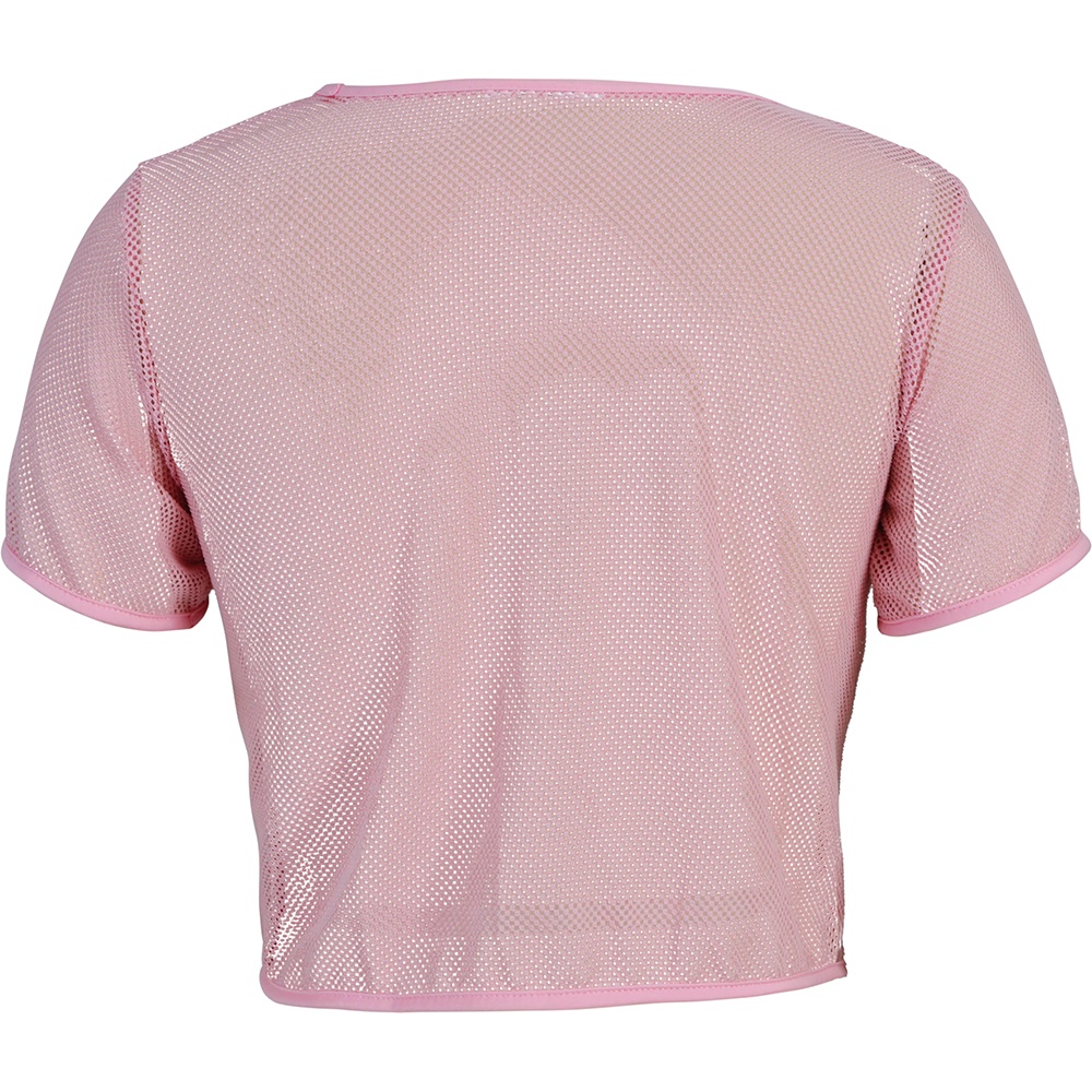 Roze mesh-top "Party Girls" die een speels en vrouwelijk accent geeft aan iedere feestoutfit. De transparante meshstof en het cropped model maken het een luchtig en opvallend item. De "Party Girls"-print geeft persoonlijkheid en is perfect voor vrijgezellenfeesten en avondjes uit. Veelzijdig te combineren over tops, bikini's of aansluitende kleding voor een gedurfde look.