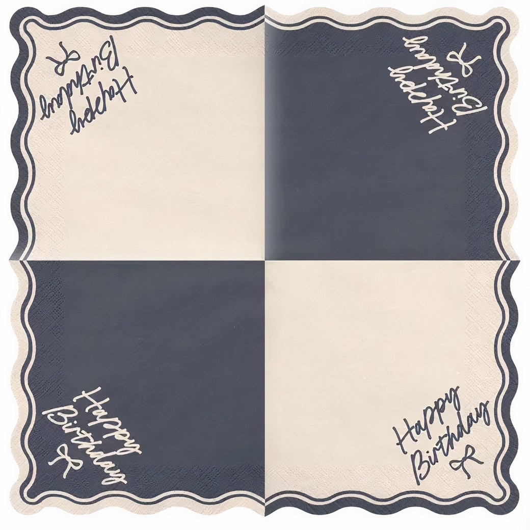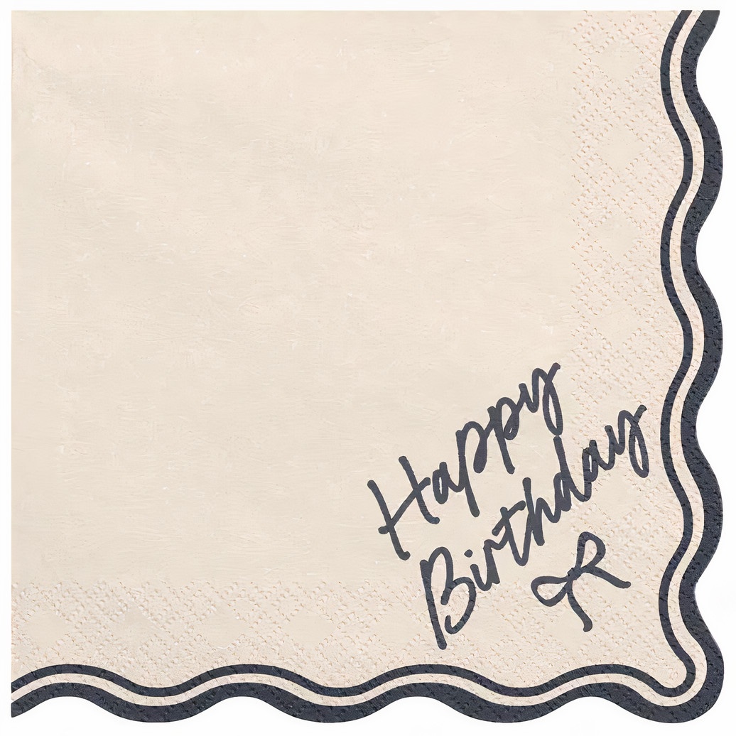 2-laagse papieren servetten met het elegante "Happy Birthday Bow"-design in beige en zwart. Het motief combineert een handgeschreven lettertype met een golfrand, wat de tafel een verfijnde uitstraling geeft. Afmetingen uitgevouwen: 33 x 33 cm; gevouwen: 16,5 x 16,5 cm. Geleverd in praktische verpakkingen - ideaal voor stijlvolle verjaardagsfeesten en bijeenkomsten.
